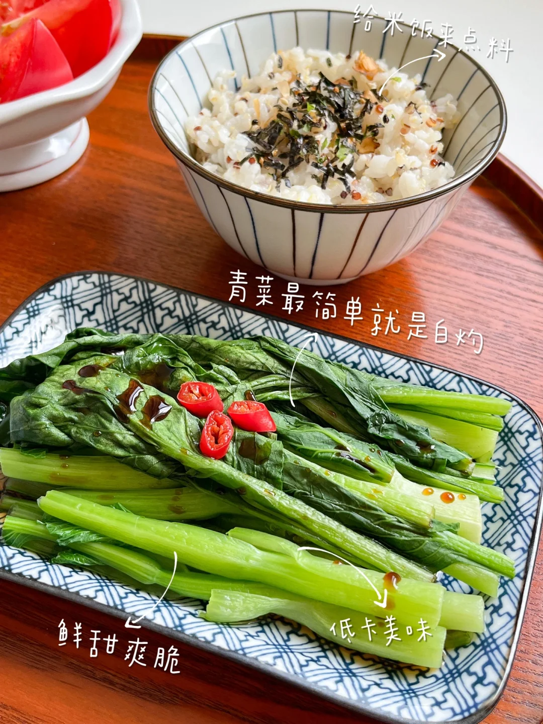 菜心用盐和几滴油焯一下,水开30秒就可以捞叶子,再过一分钟捞杆子。出锅淋上海鲜酱油和蒜末,这样一盘鲜甜多汁的菜心就做好了