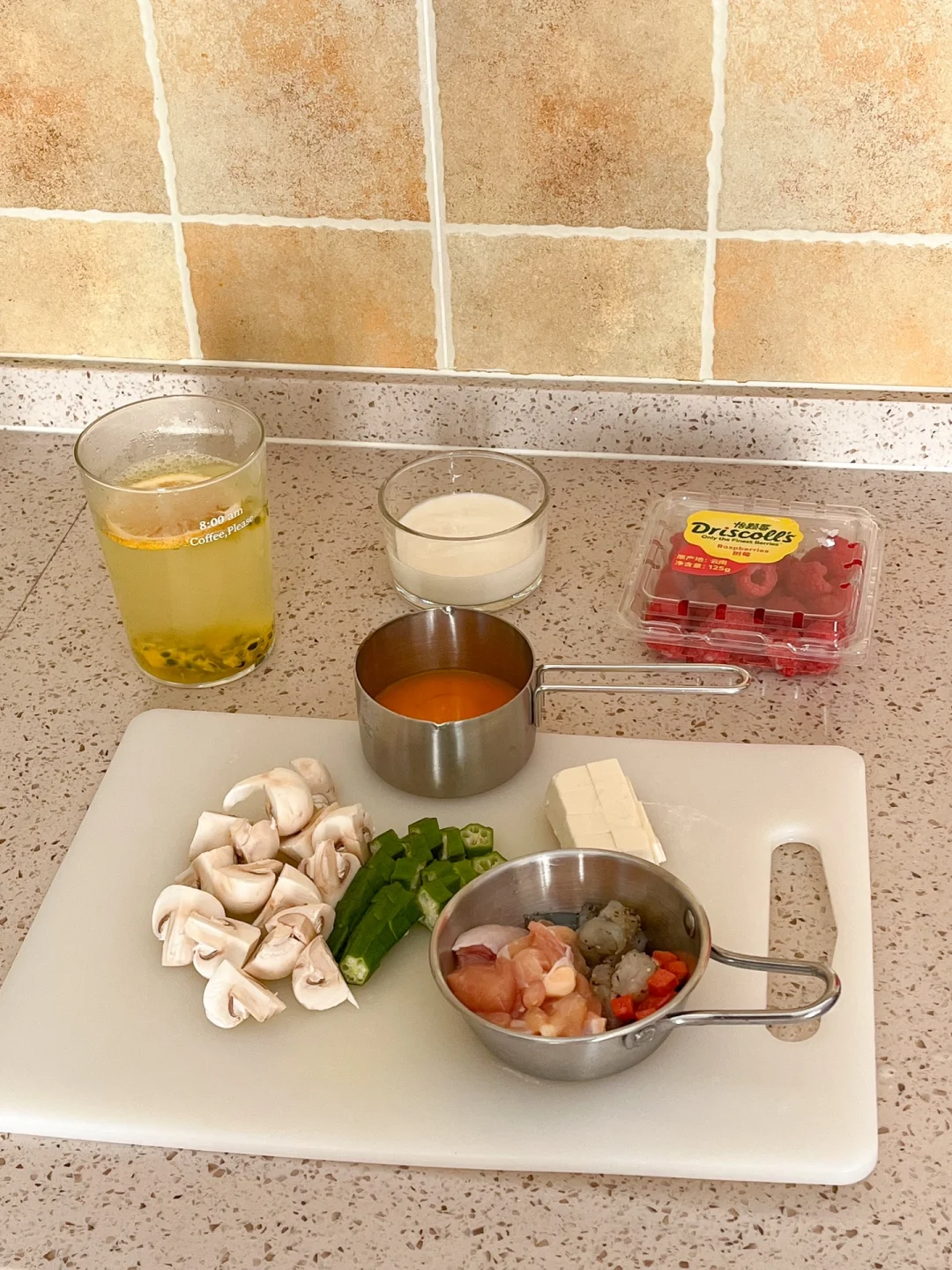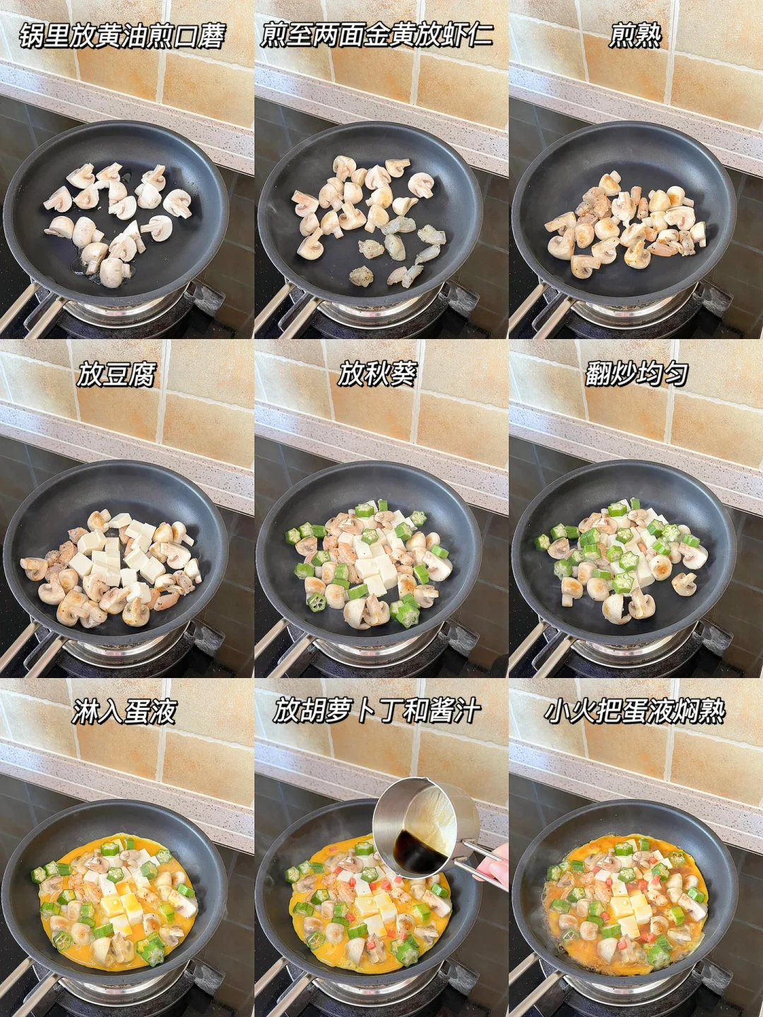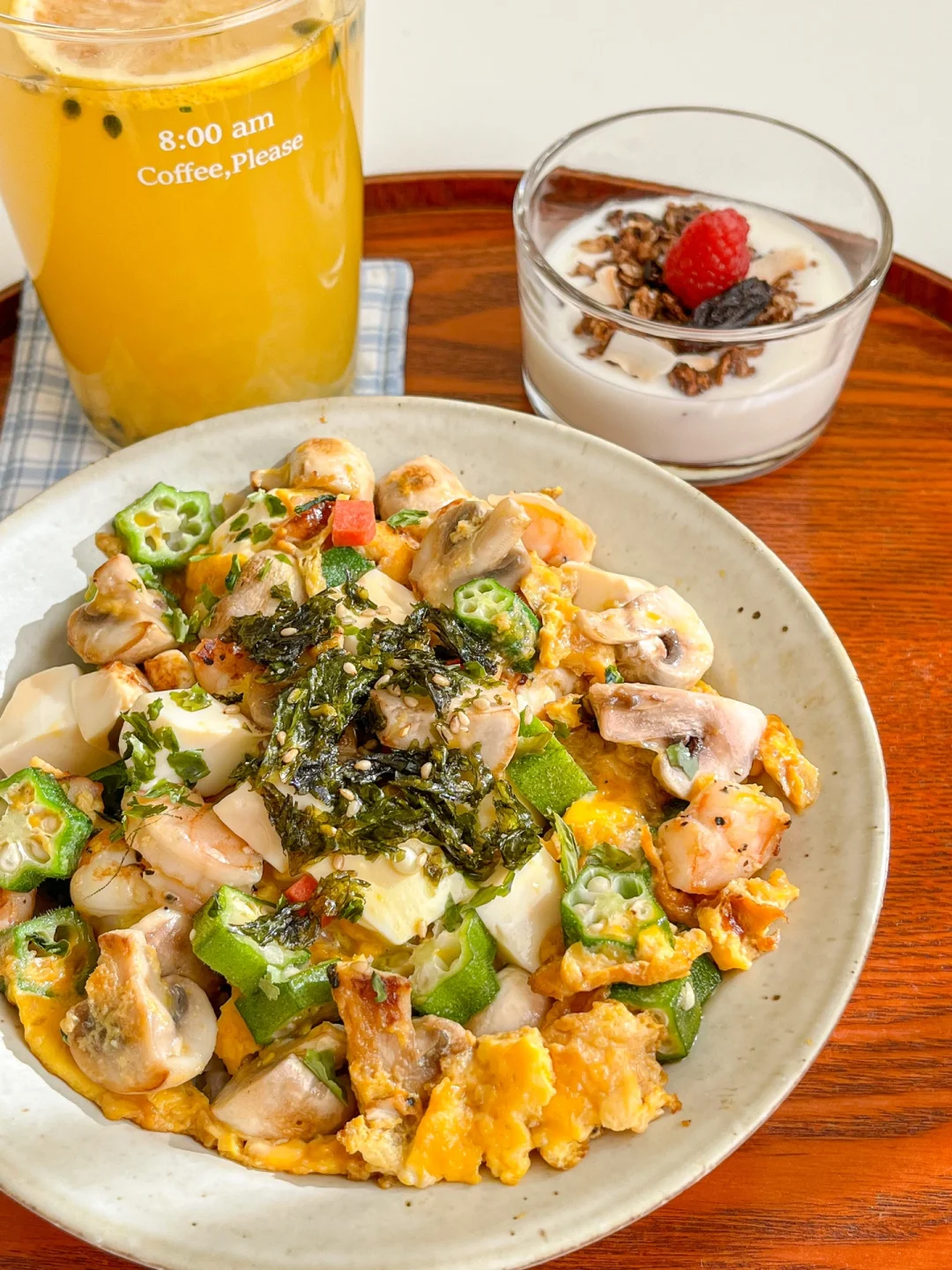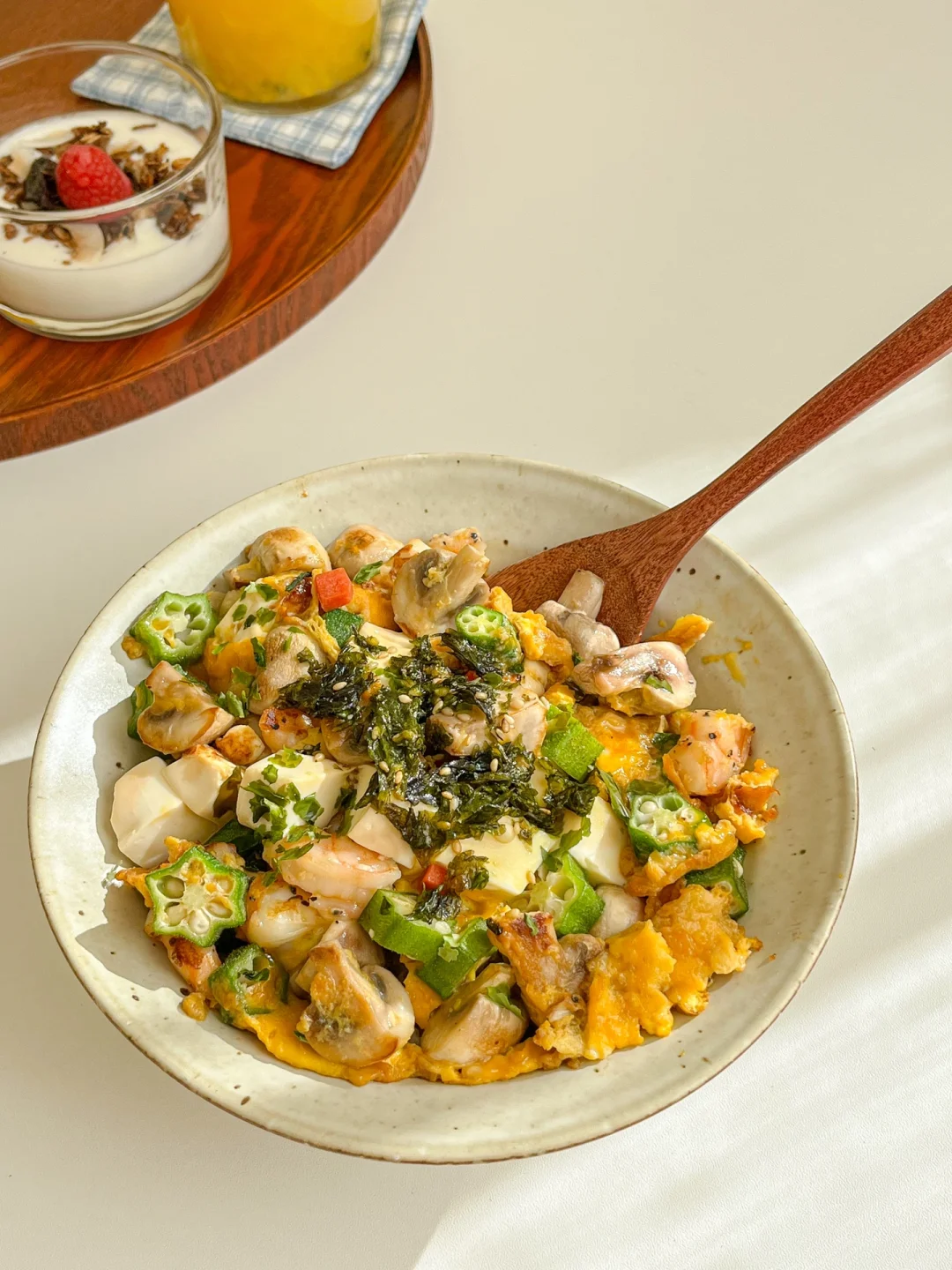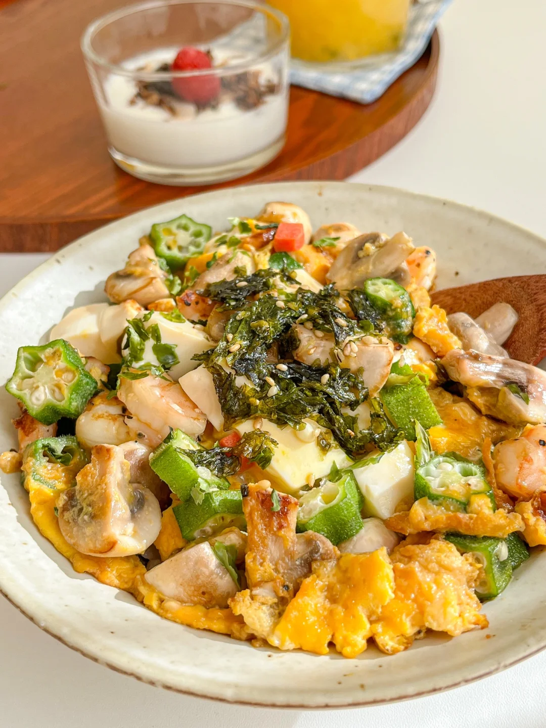 “我们的饮食习惯是米饭或面食搭配炒菜。不吃米饭或面食可能会导致精神压力大,也很难长期坚持下去。可以试试健康的饮食搭配,多吃菜少吃主食。从今天开始,试试主食就只吃半份吧~” 今日午餐: ¹日式秋葵菌菇虾仁豆腐饭 ²麦片树莓酸奶 ³百香果柠檬橙汁 🍱食材: 嫩豆腐、口蘑、虾仁、秋葵、胡萝卜、鸡蛋 🧂调味料: 寿喜烧汁 🍽做法: ❶锅里放黄油煎口蘑和虾仁 ❷炒熟放豆腐,翻炒均匀放秋葵 ❸淋上蛋液,放胡萝卜丁 ❹淋上酱汁,盖上盖焖2分钟 ❺出锅放白芝麻海苔碎