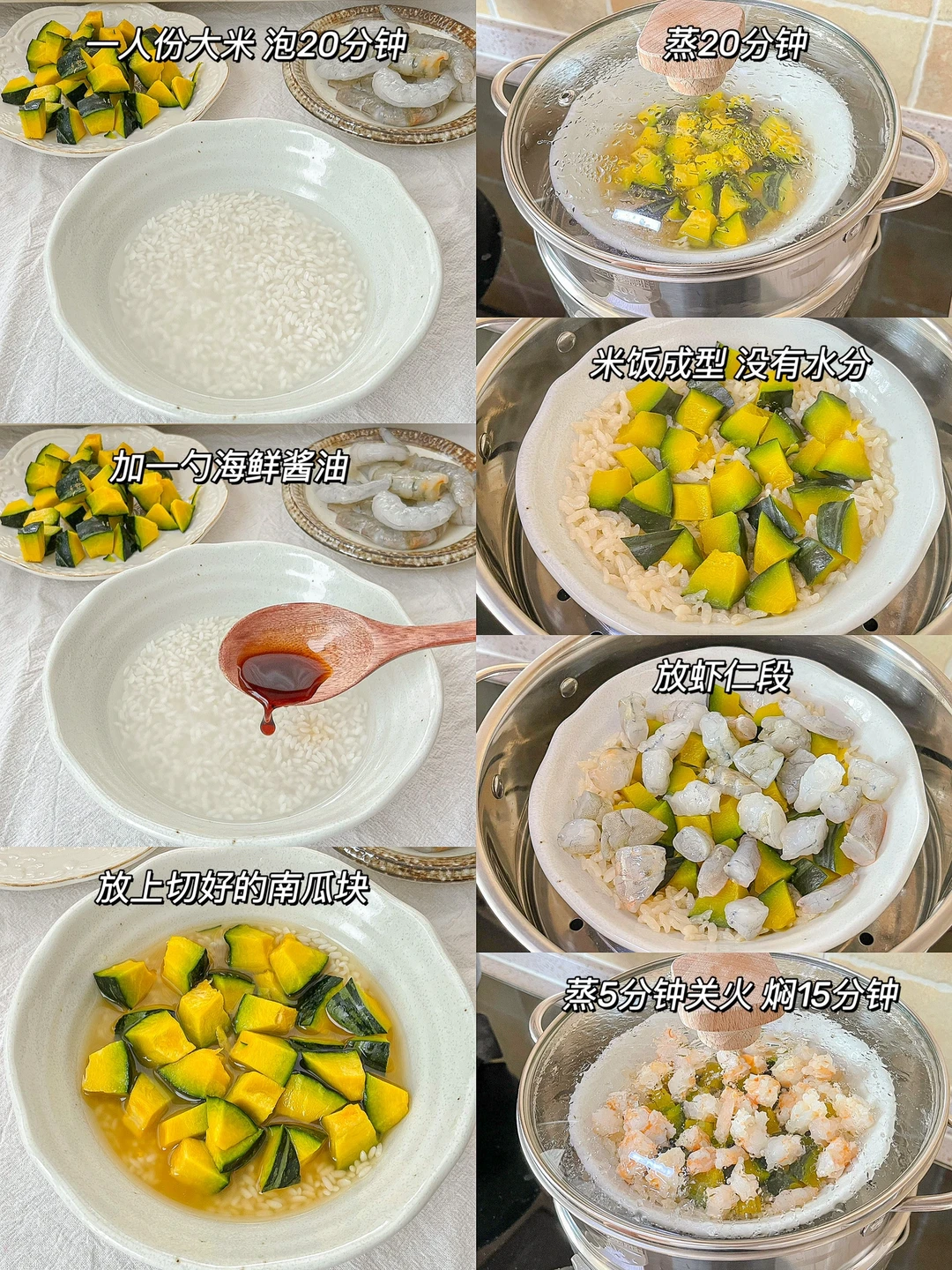 又买了甜甜的贝贝南瓜,来做个一人份蒸饭。一个人吃饭,又不想焖一锅米饭,可以试试~甜滋滋,又面又糯的贝贝南瓜和Q弹的虾仁,真的是绝配!