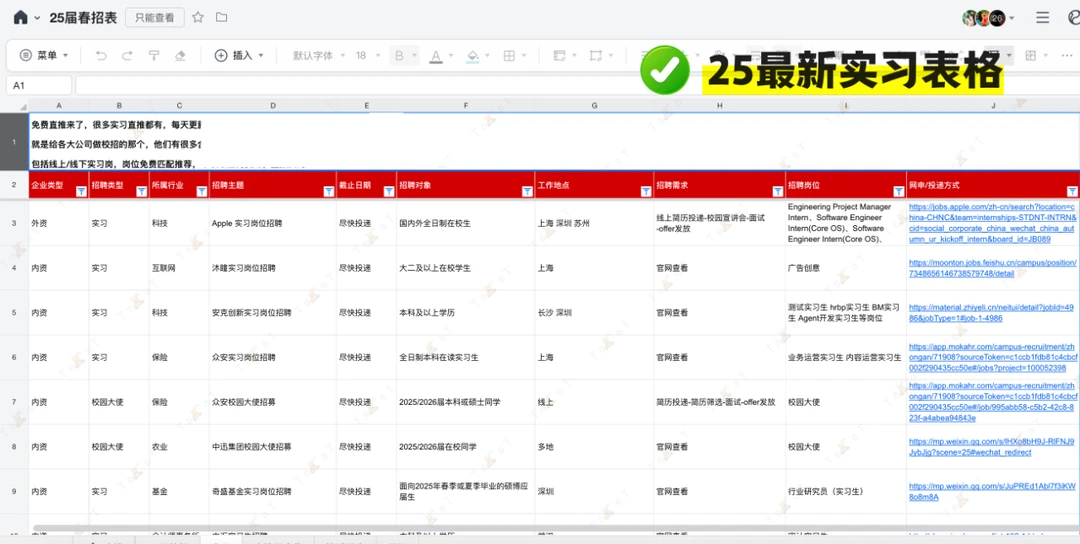 有了春招信息汇总表,岗位根本多到投不完 ⭐此为2025春招信息汇总在线文档表 👉企业包括:央国企,民企,事业单位,外企,股份/集体/混合/其他及中外合资/港资/台资。 ❗️更新时间:每周二、四、六,持续更新到2025年6月30日春招结束。 ❤可筛选内容包含:公司全称,批次(春招/提前批),企业性质,行业分类,招聘对象,工作地点,招聘岗位,截止时间等。 🟢可直接跳转至:官方公告,网申投递。 春招分享 春招 秋招 求职 求职招聘 岗位