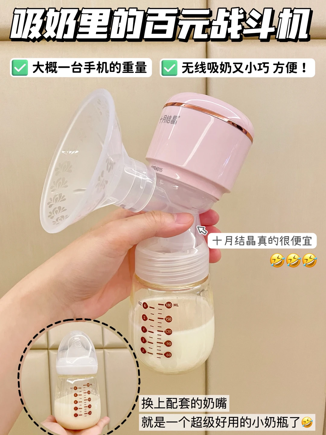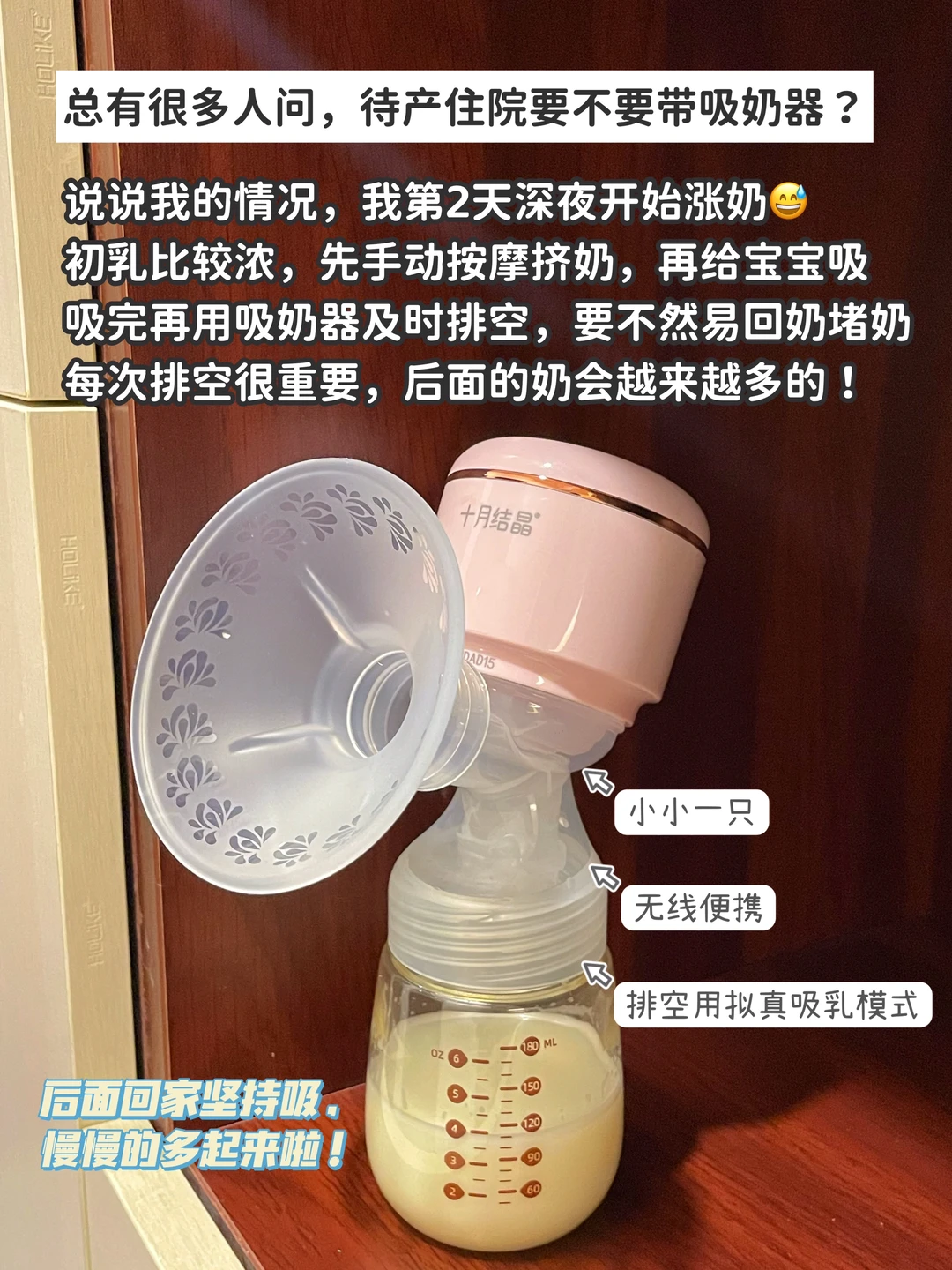 🔹待产包已经挺多东西了,如果你想从简,可以买一体式的电动吸奶器。一小只轻巧很多,不会占很多空间,带去医院待产非常方便。不用买太贵,好用舒适就行,如十月结晶的一体式吸奶器就很不错了,仅仅一部手机的重量,100来块💰的战斗机。