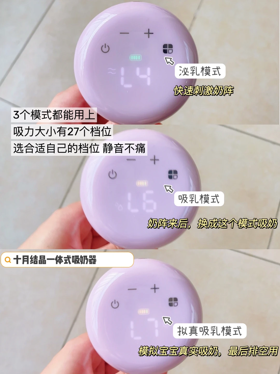 🔹里面的3种模式都能用到,吸力大小有27挡,你能找到刚好适合自己的那一档,而不会出现多一档痛、少一档不够力的糟心情况。而且配了奶嘴,吸出来换个奶嘴就可以直接给宝宝喝了,很方便哈哈。