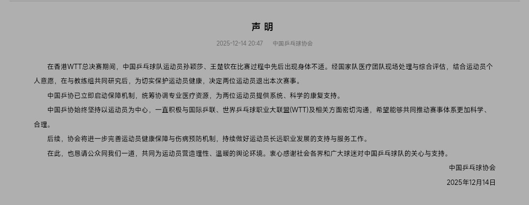 | 2025年12月14日,中国乒协就孙颖莎、王楚钦在世界乒乓球职业大联盟(WTT)香港总决赛期间因伤退赛一事作出回应,这一事件不仅牵动着广大球迷的心,更引发了对运动员健康保障和赛事体系合理性的思考。孙颖莎和王楚钦作为国乒的优秀运动员,在赛场上一直拼搏奋进,为国家赢得了众多荣誉。然而,此次在WTT香港总决赛中,两人先后因身体不适退赛。孙颖莎在女单半决赛中脚踝受伤,即便经过医疗处理仍坚持比赛,但最终因伤势加剧无奈退赛;王楚钦也在男单半决赛前宣布因伤退赛。他们的退赛,让无数球迷感到心疼和惋惜,也让我们看到了运动员在追求竞技成绩背后所承受的巨大身体压力。运动员长期处于高强度的训练和比赛状态,身体极易出现伤病。孙颖莎在短短27个小时内打了五场比赛,过去几个月更是连续作战,几乎没有足够的休息时间,如此密集的赛程无疑增加了她受伤的风险。这反映出目前对运动员身体状况的监测和评估可能还不够及时、全面,在运动员出现伤病隐患时,未能及时采取有效的预防和调整措施。而从赛事体系的角度分析,国际乒联安排的赛制和赛程合理性值得商榷。不合理的赛程使得运动员身心俱疲,不仅影响了他们的竞技状态,更对身体健康造成了严重威胁。就像孙颖莎和王楚钦的退赛,很大程度上是密集赛程导致的伤病积累所致。赛事组织者应该更加注重运动员的身心健康,科学合理地安排赛程,避免过度消耗运动员的体力和精力。中国乒协在声明中表示将进一步完善运动员健康保障与伤病预防机制,持续做好运动员长远职业发展的支持与服务工作,这是一个积极的信号。同时,乒协也一直积极与国际乒联、WTT等相关方面沟通,希望共同推动赛事体系更加科学、合理。这不仅体现了乒协对运动员的关怀和负责,也为解决当前问题指明了方向。运动员的健康是体育事业发展的基石,只有保障好运动员的身心健康,才能让他们在赛场上发挥出最佳水平。希望此次事件能成为一个契机,促使各方共同努力,完善运动员健康保障体系,优化赛事安排,让运动员能够在健康、科学的环境中追逐梦想,为中国体育事业创造更多的辉煌。