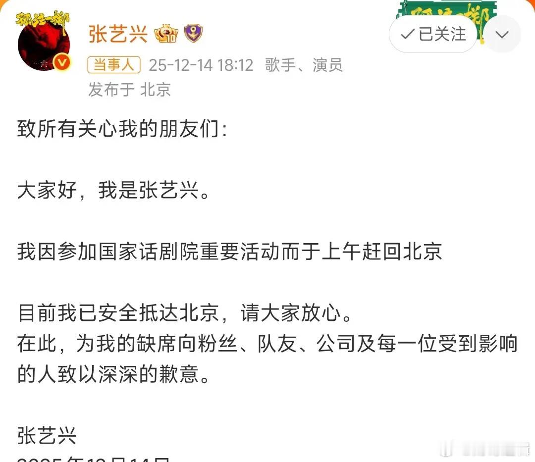 张艺兴缺席EXO粉丝见面会,经纪公司SM此前仅以“不可抗力”回应,惹粉丝不满。随后张艺兴发文澄清:因紧急返京参加国家话剧院重要活动,已安全抵达,同时向粉丝、队友等致歉,态度诚恳获网友理解,称“国家任务优先级更高”。据悉,他为见面会提前半月赴韩闭关排练,缺席本人也遗憾。目前网友将矛头指向SM,质疑其协调失职、未提前告知,致粉丝承受经济损失,而SM暂未进一步回应。你觉得SM是否失职?张艺兴发文道歉