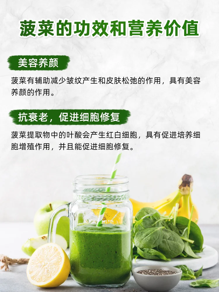 菠菜提取物中的叶酸会产生红白细胞,具有促进培养细胞增殖作用,并且能促进细胞修复。