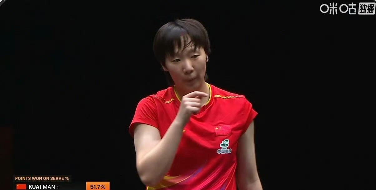蒯曼🇨🇳进步不小[赞], 第二局蒯曼2-8落后,竟然连追9分,拿下了第二局, 追分的那些球,蒯曼使用了正手开大角这极有威胁力的打法。 这是2025WTT香港总决赛女单半决赛,大比分曼昱2-1领先。 目前第四局曼昱3-0领先,蒯曼叫了暂停。 暂停回来曼昱不仅加了速度,还加了旋转。 这是2025WTT香港总决赛女单决赛。 蒯曼也提速了,决赛场上的蒯曼显得更凌厉了。目前第四局曼昱5-3领先,这时曼昱也叫了暂停!