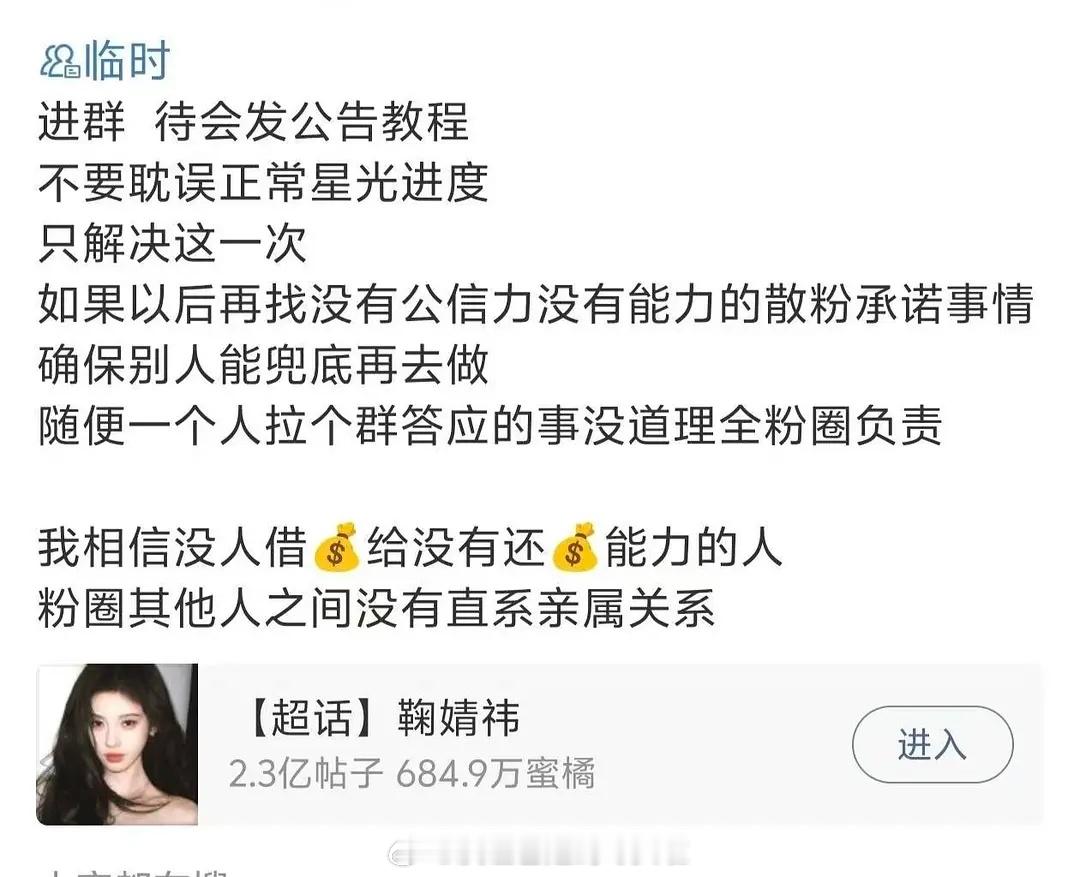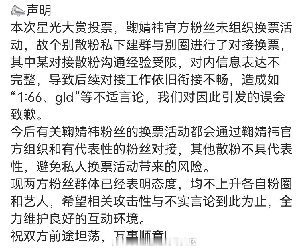 鞠婧祎和魔道师祖双方粉丝发声明了:鞠婧祎大粉协助处理后续事宜,建群还票并规范散粉私自接单行为,魔道祖师粉丝澄清橘丝并未骗票。