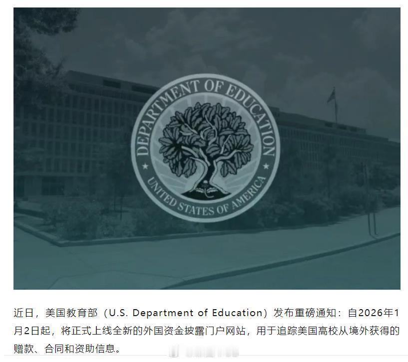 【这个轨接不接?】近日美国教育部宣布,将于2026年1月2日正式启用全新外国资金披露门户网站,用于追踪美国高校从境外获得的赠款、合同和资助信息,旨在加强对外国捐赠及合作的监管。目的就是为了保护美国国家安全,防止外国影响力进入美国高校研究体系 与谁合作,与合作者什么关系,多少钱,用来干什么,高校必须主动报备,必须主动给自己贴标签,这个项目是与某某境外机构合作,要亮明身份、公开账本,不能仅凭教授学者身份而回避,整个过程必须强制执行