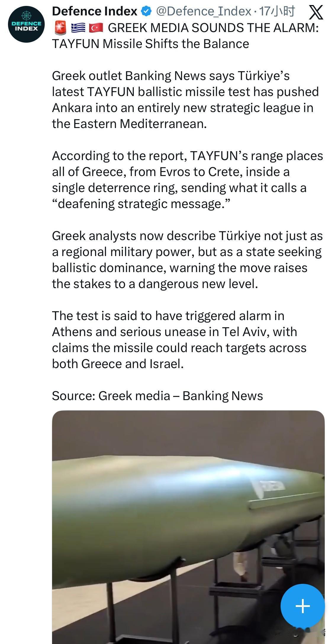 希腊媒体发出警报:泰丰导弹改变了局势 希腊媒体《银行业新闻》称,土耳其最新的“泰丰”弹道导弹试验已将安卡拉推入东地中海一个全新的战略格局。 报告称,TAYFUN 的射程将整个希腊,从埃夫罗斯到克里特岛,都置于一个威慑圈内,发出了所谓的“震耳欲聋的战略信号”。 希腊分析人士现在将土耳其描述为一个不仅在地区内拥有军事实力,而且正在寻求弹道导弹优势的国家,并警告说,此举将局势提升到了一个危险的新水平。 据称,此次试验在雅典引发了警报,在特拉维夫引起了严重不安,有人声称该导弹可能击中希腊和以色列境内的目标。