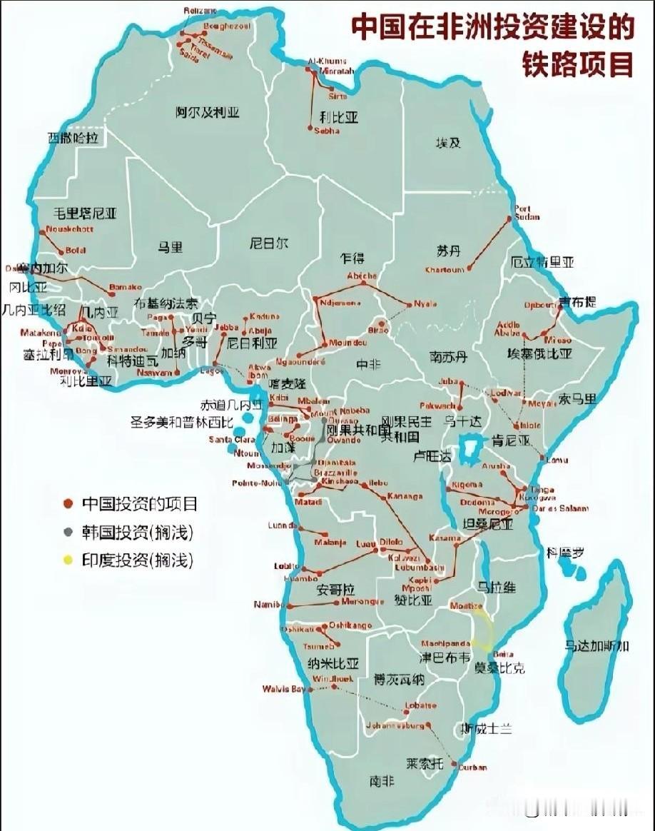 中国在非洲投资建设的铁路项目示意图(图片红色标注属于我国在非洲各国的铁路投资项目),我国现在再非洲许多国家都有投资建设铁路项目,可见中国与非洲的铁路项目合作还是比较密切的,非洲总面积大约达到了3000万平方公里左右,未来的发展空间非常广阔,对非洲的铁路项目投资建设,对我国与非洲都是双赢互惠共利的局面。
