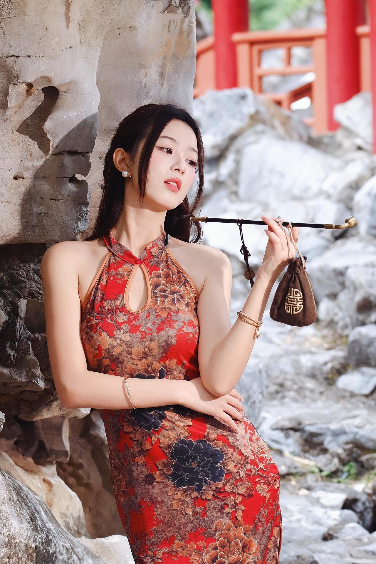 《亭畔旗袍》 原创诗词 原创看图片配诗 丹衣缠颈缀花浓,团扇轻摇亭下风。 石畔簪香春欲醉,一弯云鬓落惊鸿。