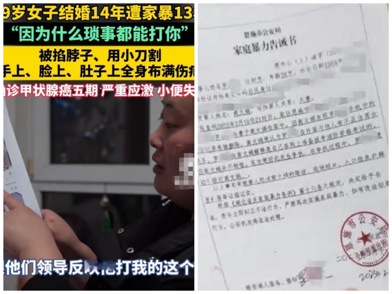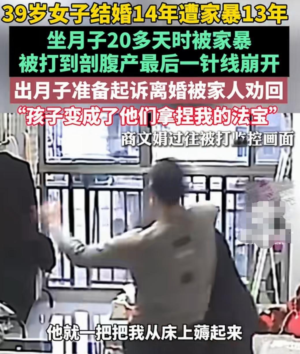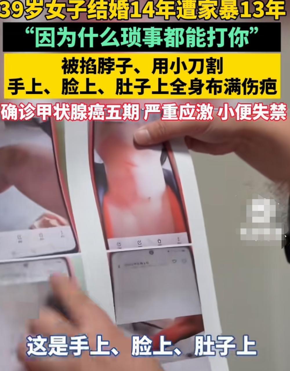 震怒!39岁女子结婚14年,竟遭家暴13年,被丈夫掐脖子、扇耳光,用枕头捂头拳打脚踢,全身布满伤疤,确诊甲状腺癌,严重应激导致大小便失禁。 以上就是辽宁大连女子商文娟的遭遇,其和丈夫网恋认识,后奔现恋爱半年,嫁到湖北宜昌。 恋爱时男的花言巧语,婚后原形毕露,第一次动手是在商文娟怀孕8个月的时候,因没给小姑子乔迁红包,被丈夫怀疑挑拨关系,惨遭殴打,致嘴巴出血,眼睛肿胀。 第二次动手,在商文娟坐月子期间,因一点琐事,丈夫脚踹开卧室门殴打她,致使其剖腹产刀口缝线崩开。 商文娟反抗过,报过警,结果被“两口子吵架”的说辞劝退,也去丈夫单位找过领导,她丈夫当着领导的面,把她从办公室一路打到马路边。 此后每打一次,商文娟只要提出离婚,丈夫就声泪俱下的道歉写保证书,说为了孩子有个完整的家,以后不动手。 天真的她信一次就算了,可她信了13年,让她鼓起气揭露丈夫家暴行径,是因为孩子画画得了奖,丈夫却因为嫌他买画纸花了1块钱,狂扇儿子耳光。 带孩子去游泳的时候,把孩子头往泳池里按,简直不配做人父,把最亲的两个人,当成随时可以撒气出气筒。 家暴只有零次和无数次,没什么比自己的命重要,商文娟申请过人身保护令,但换来是其丈夫更加严重家暴。 当前商文娟醒悟了,起诉丈夫家暴的同时,还坚持追究刑事责任,今天12月15日开庭! 家暴 结婚后被家暴