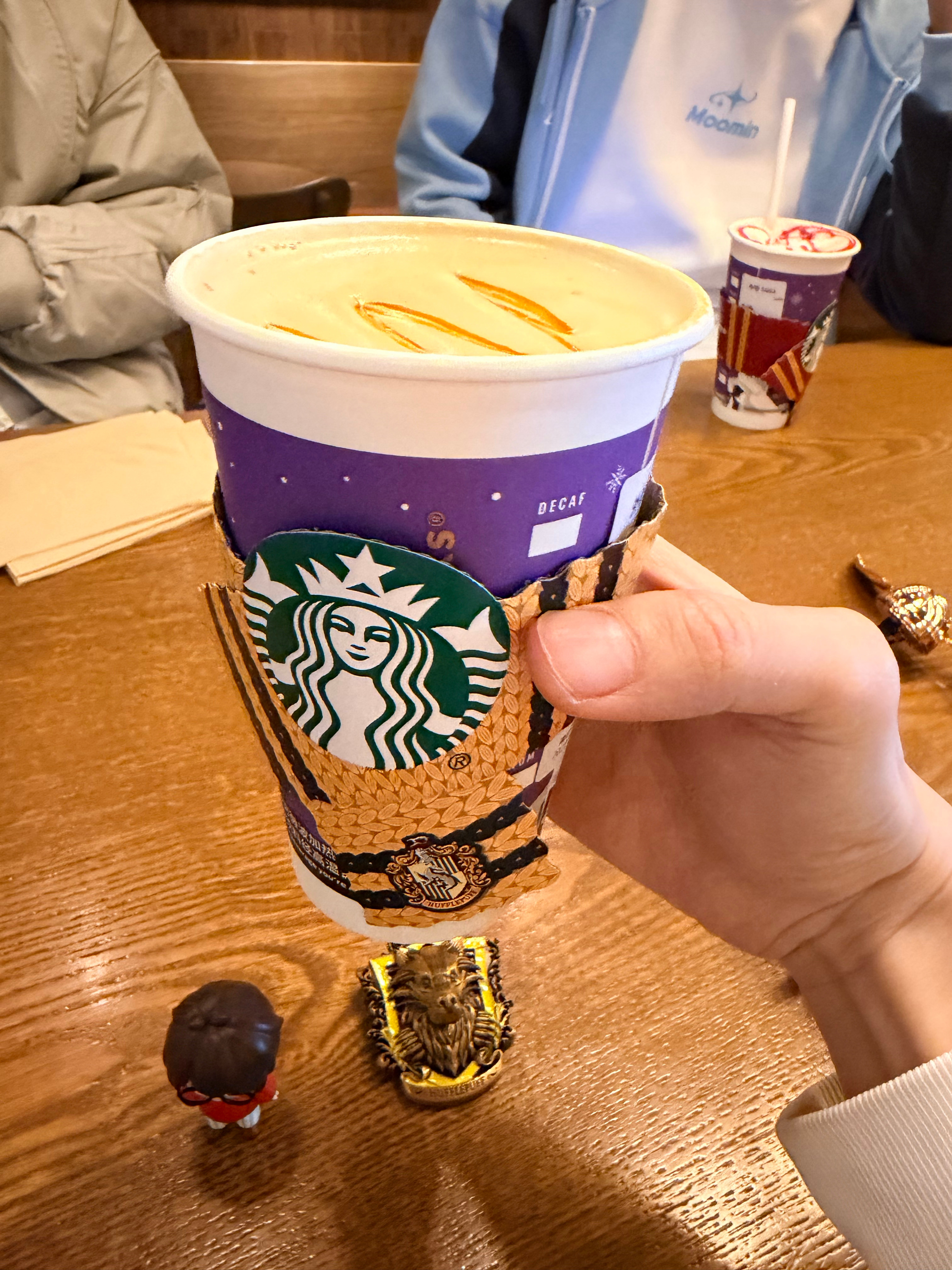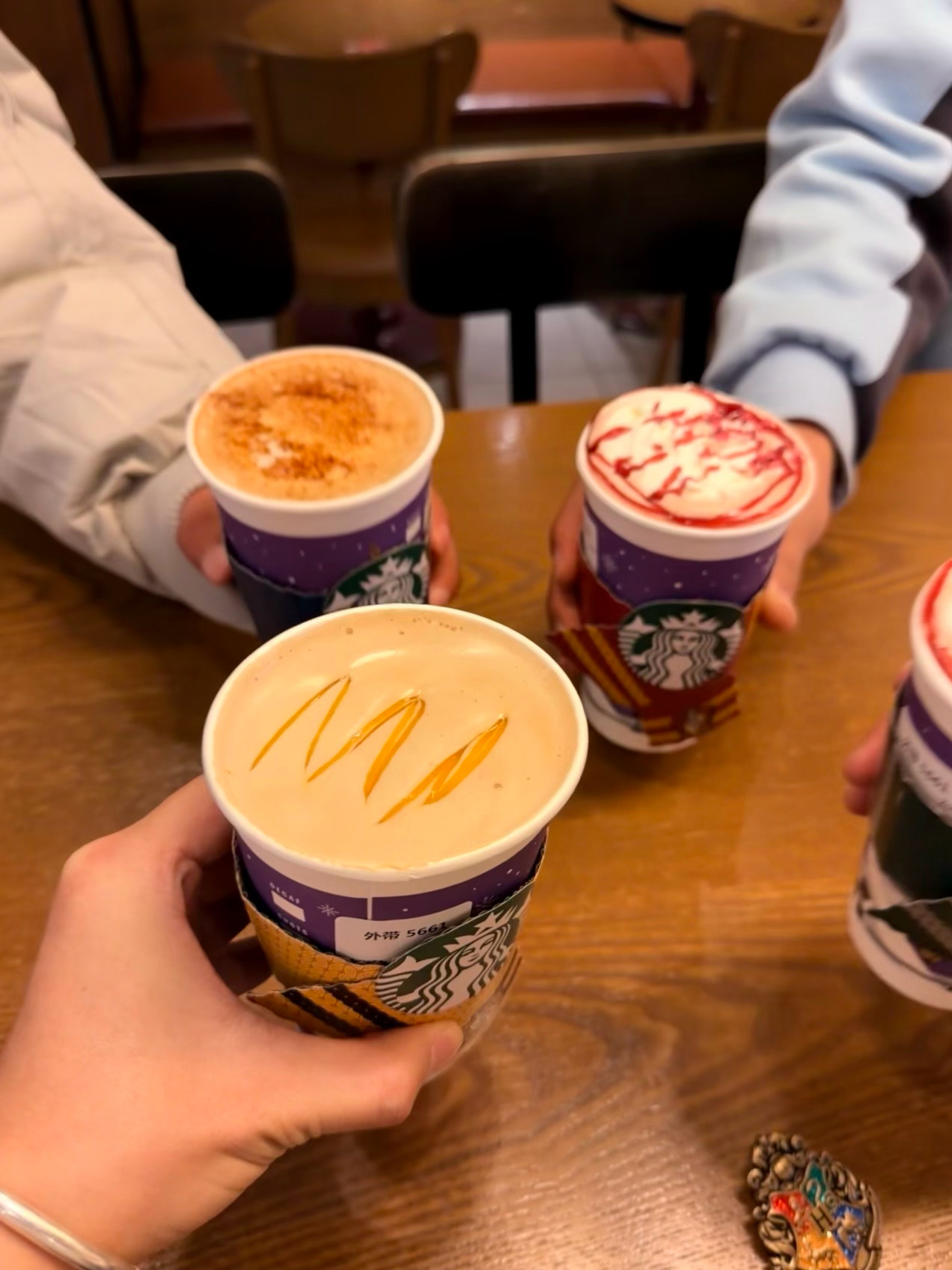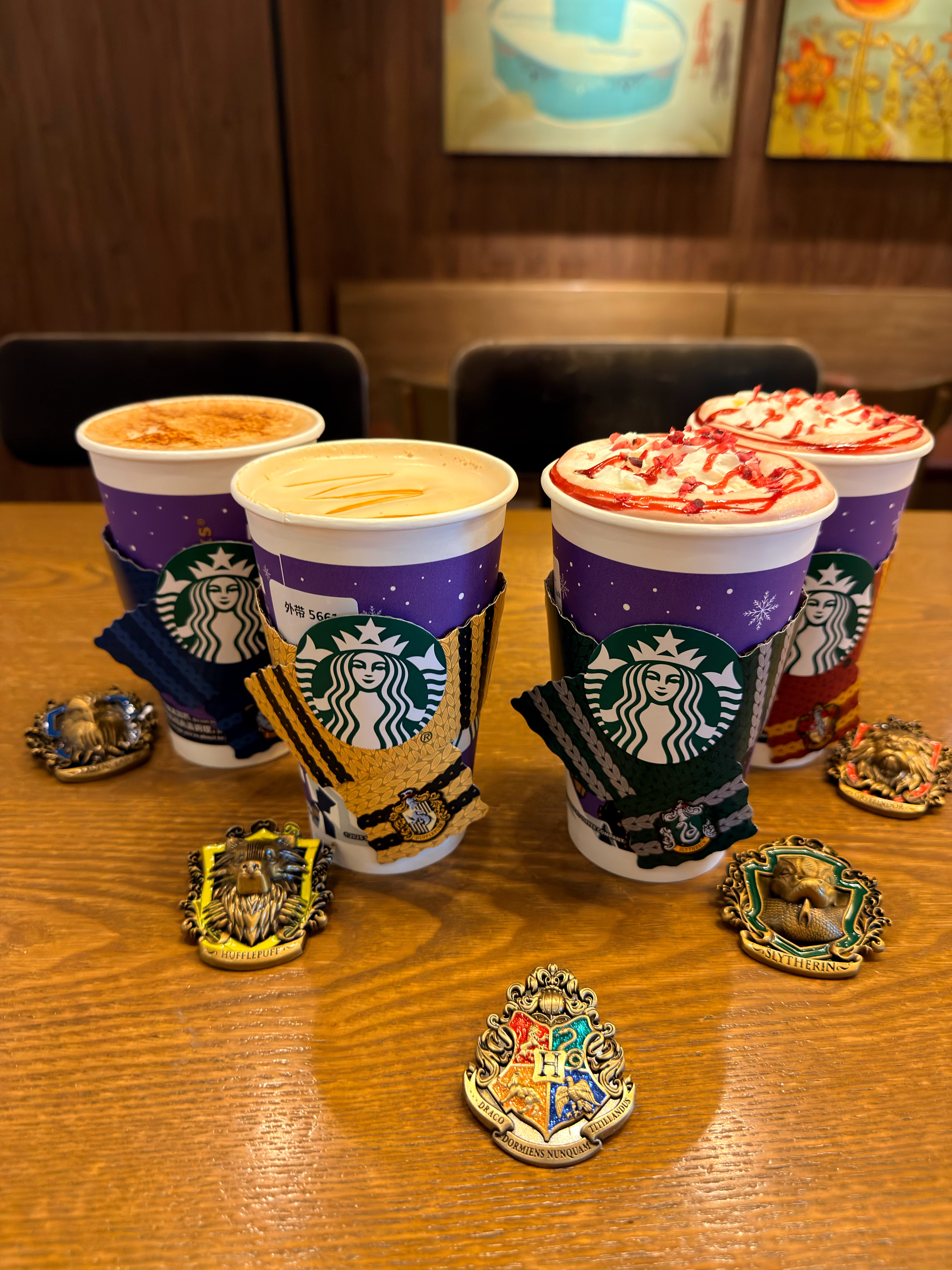 周末和三位巫师同学一起尝了星巴克哈利·波特联名热饮!我点了伯爵茶橙柚拿铁,选了少果酱,口感顺滑不甜腻,值得一试。可惜加购的魔杖摆件当天就没了…这也太快了吧!
