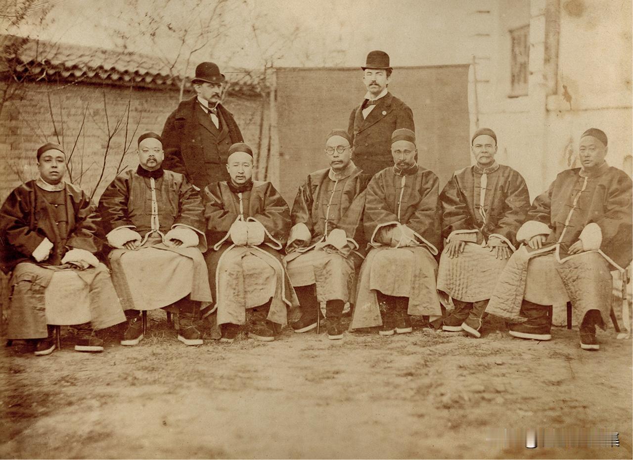 1880年代初北洋水师筹建时期,清廷洋务运动核心人物与德国顾问的珍贵合影。左三为盛宣怀,时任李鸿章幕僚,是洋务运动的重要推动者;左二为刘含芳,时任二品衔直隶候补道员,负责筹办旅顺、威海鱼雷营;右二为曾恒忠,也是洋务派重要官员。后排两位德国人分别是穆麟德和瑞乃尔,他们协助清廷购买新式军火及训练北洋水师。