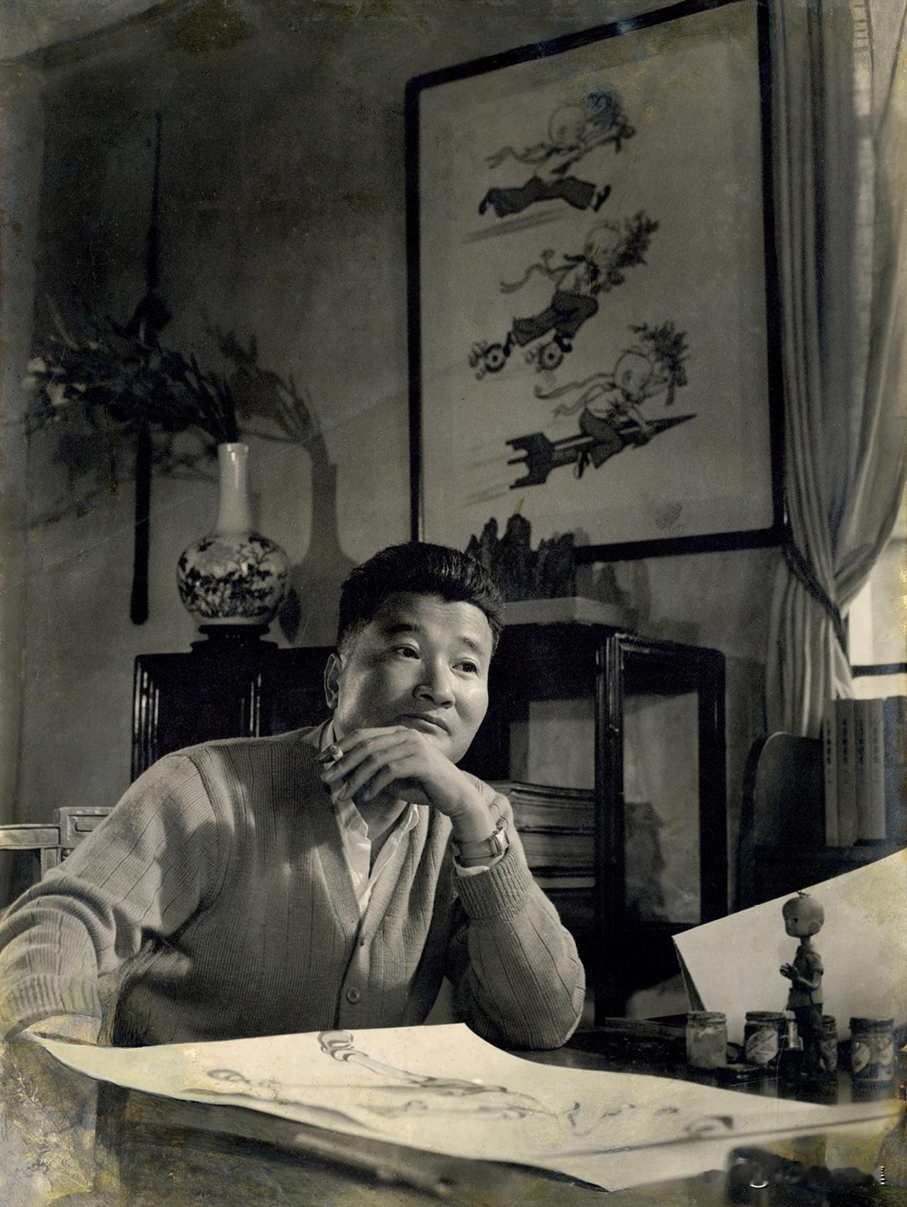“三毛之父”张乐平在创作间隙的温馨瞬间。照片中,张乐平神情自若,呈现了这位漫画大师在创作过程中的轻松状态。特别引人注目的是,照片后方悬挂的画框里展示的是带有“三毛乘火箭”元素的漫画作品,这反映了张乐平晚年创作的新题材——将三毛形象与科技元素结合,展现新时代的儿童生活。