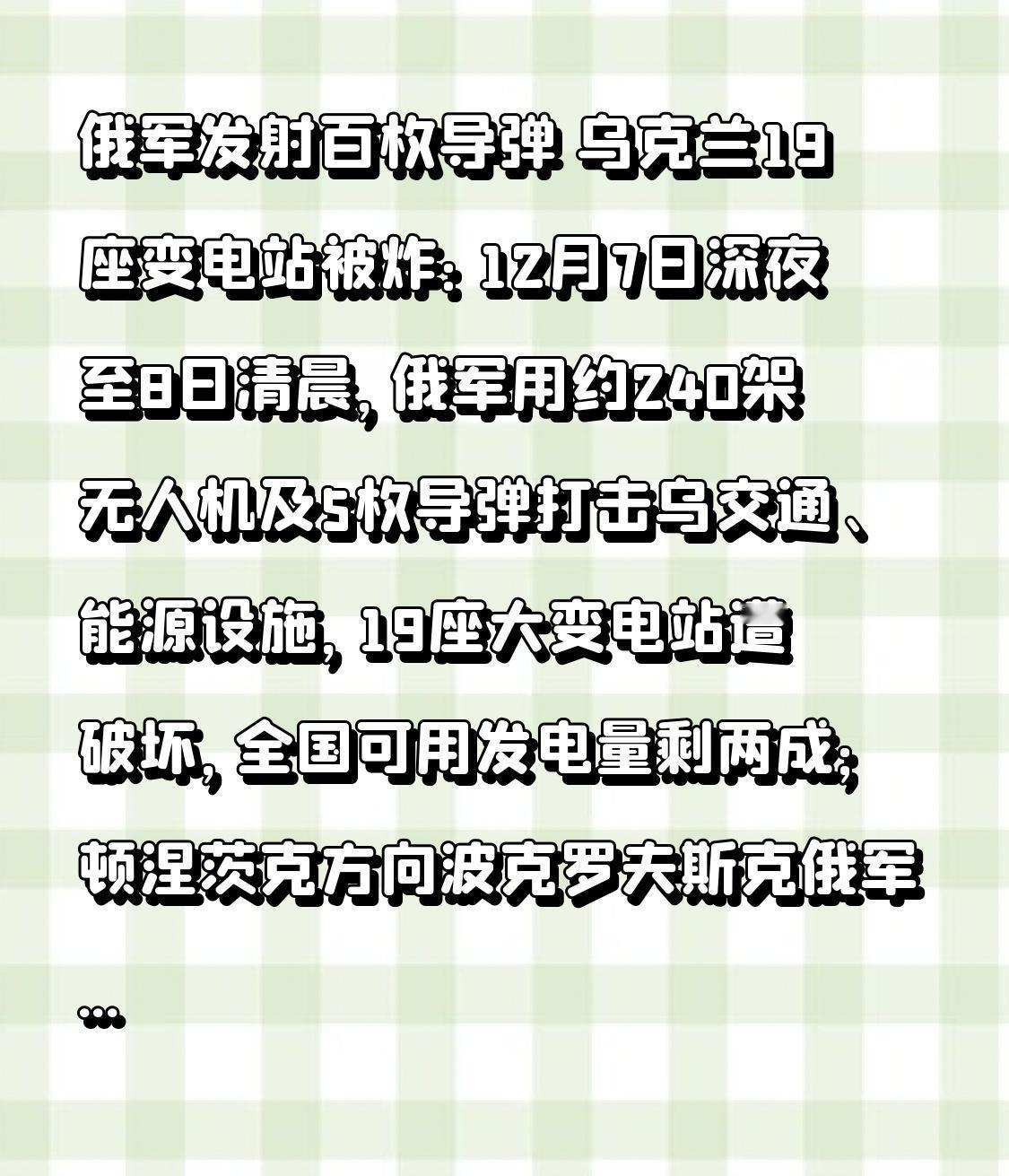俄军发射百枚导弹 乌克兰19座变电站被炸:12月7日深夜至8日清晨,俄军用约240架无人机及5枚导弹打击乌交通、能源设施,19座大变电站遭破坏,全国可用发电量剩两成;顿涅茨克方向波克罗夫斯克俄军控制大部分城区,谢韦尔斯克俄军占市中心一部分;12月9日泽连斯基说乌打算举行全国大选,请求美欧安全保障及组织帮助,而乌战时状态延长到2026年2月3日,宪法规定战时不能选举。