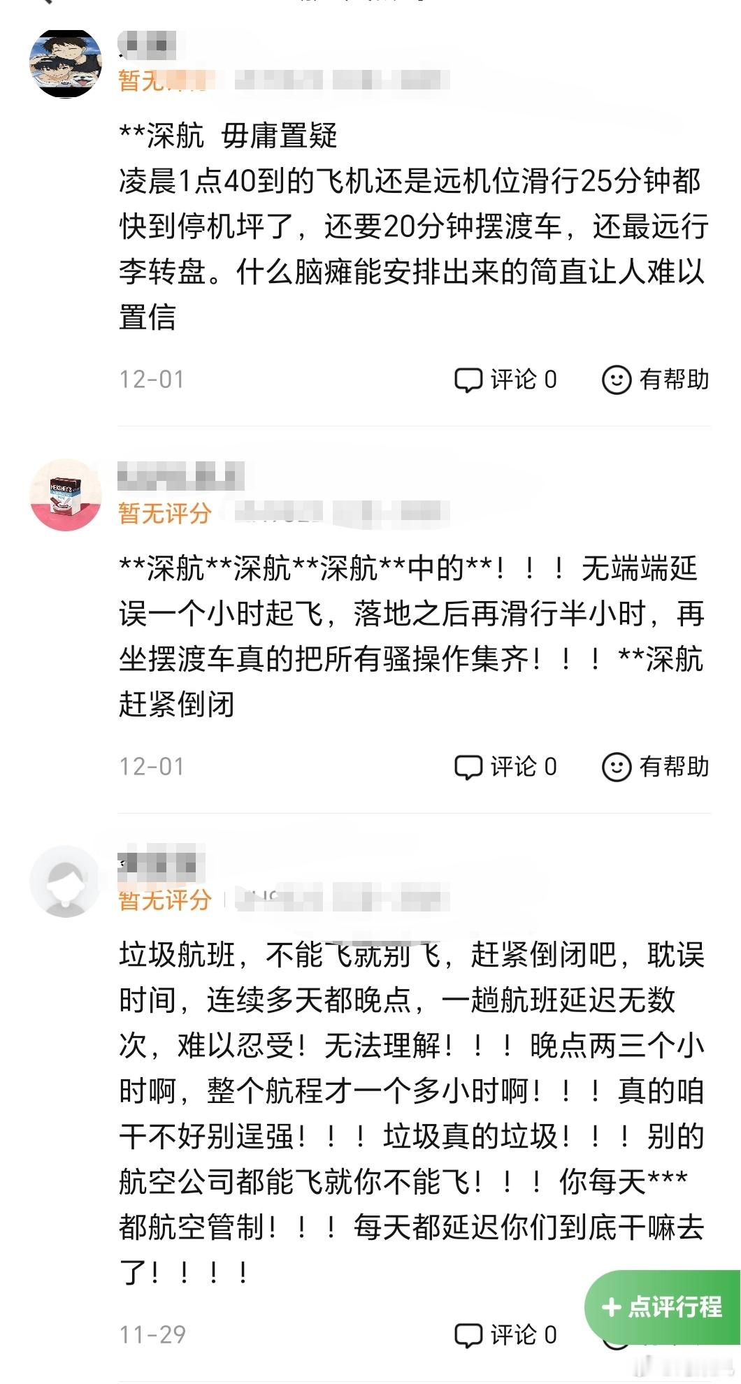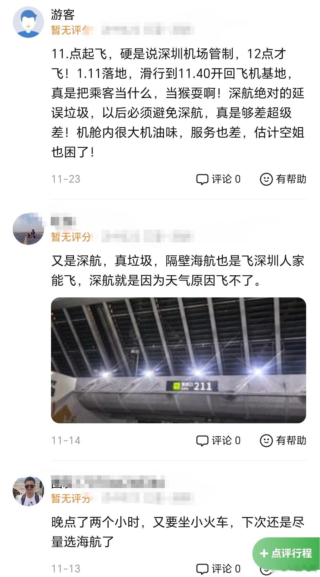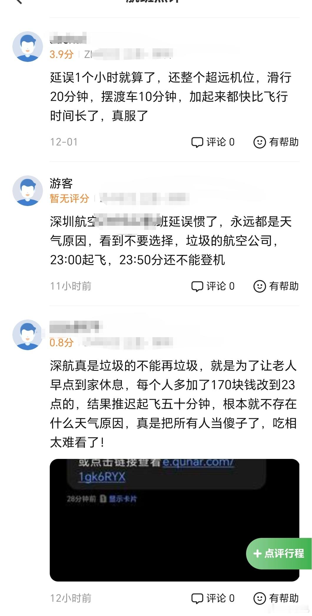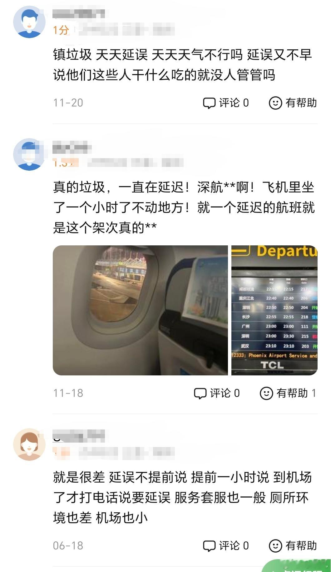 为什么要diss深圳航空,因为真的体验太差了,无敌差。昨晚海南回深圳,遇到的情况跟航旅纵横评论区网友的吐槽一模一样,除了现场没有人跟地勤吵架,其他情形几乎100%一致:一直延误、同航程其他航司起飞、超远机位。。我不知道同一航班不同日期发生同样情况的概率究竟有多大,我把评价翻到6月吐槽的都是一模一样,让人不得不怀疑深航是刻意为之,如图1网友的猜测,如果是,那真的是非常恶劣。关键这种事情还无迹可查,航线究竟有没有天气原因、管制原因没有官方可参考的信息,航司说什么就是什么,以我每年飞40-50次深航的经验来看,我同样有图1网友的猜测,又怂又贼且毫不掩饰地糊弄。深航也不是没有优点,飞泊通很好用,空姐也很热情,休息室的牛肉面很好吃,但在执飞上真的很拉胯,卫星厅也就算了,还经常超远机位,毫无理由地延误等,体验真的非常难受,遇见一次骂一次。 深圳·深圳宝安国际机场