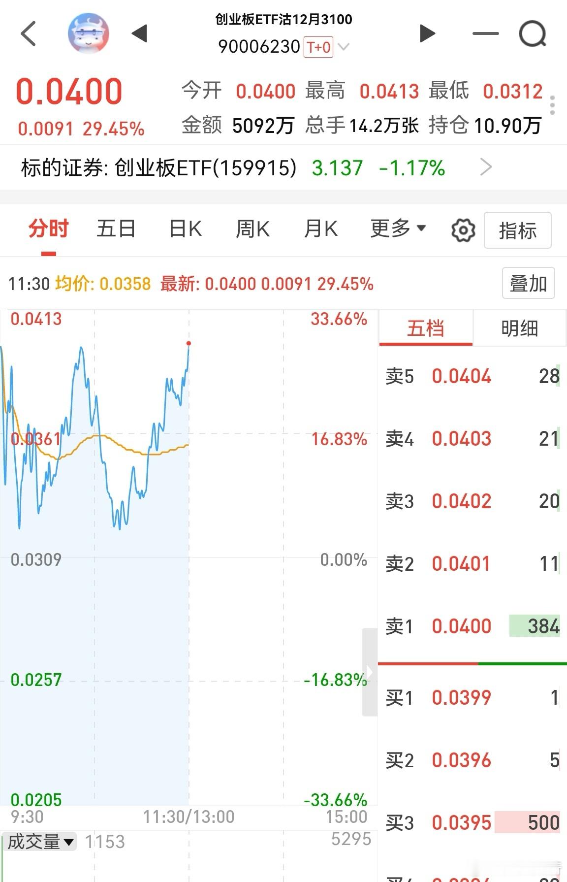 创业板半小时kdj很快低位了,大概再有半个小时,也就1点30—2点之间就有止跌需求,最迟2点—2点15分钟就有止跌反弹动力。我这三张看跌期权,早上挂单0.04成了,还有一张0.0415的没成。从这个期权可以看出,指数判断还是比较准确的。