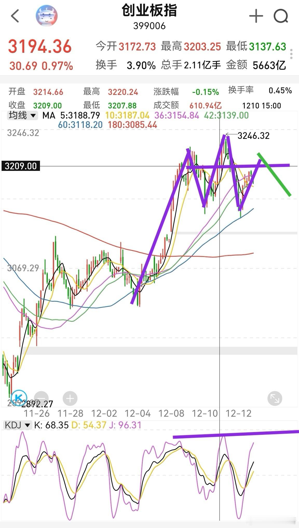 指数基本符合预期。早上画的图忘记贴上了。今天是第五天,理论上是一个变盘时间点,加上美股中阴,A股就低开了。总体思路还是3200以上择机看空,3228以上直接看空。3166附近或者以下,择机看多。这个时间周期今天过了就要重新规划。目前等今天数据。均线还没接近死叉,大回落还没到时间点。关注消费板块,明年重点提振消费。光伏逻辑是明年业绩反转。这个当时分析过东方,阐述的就是明年业绩反转逻辑。
