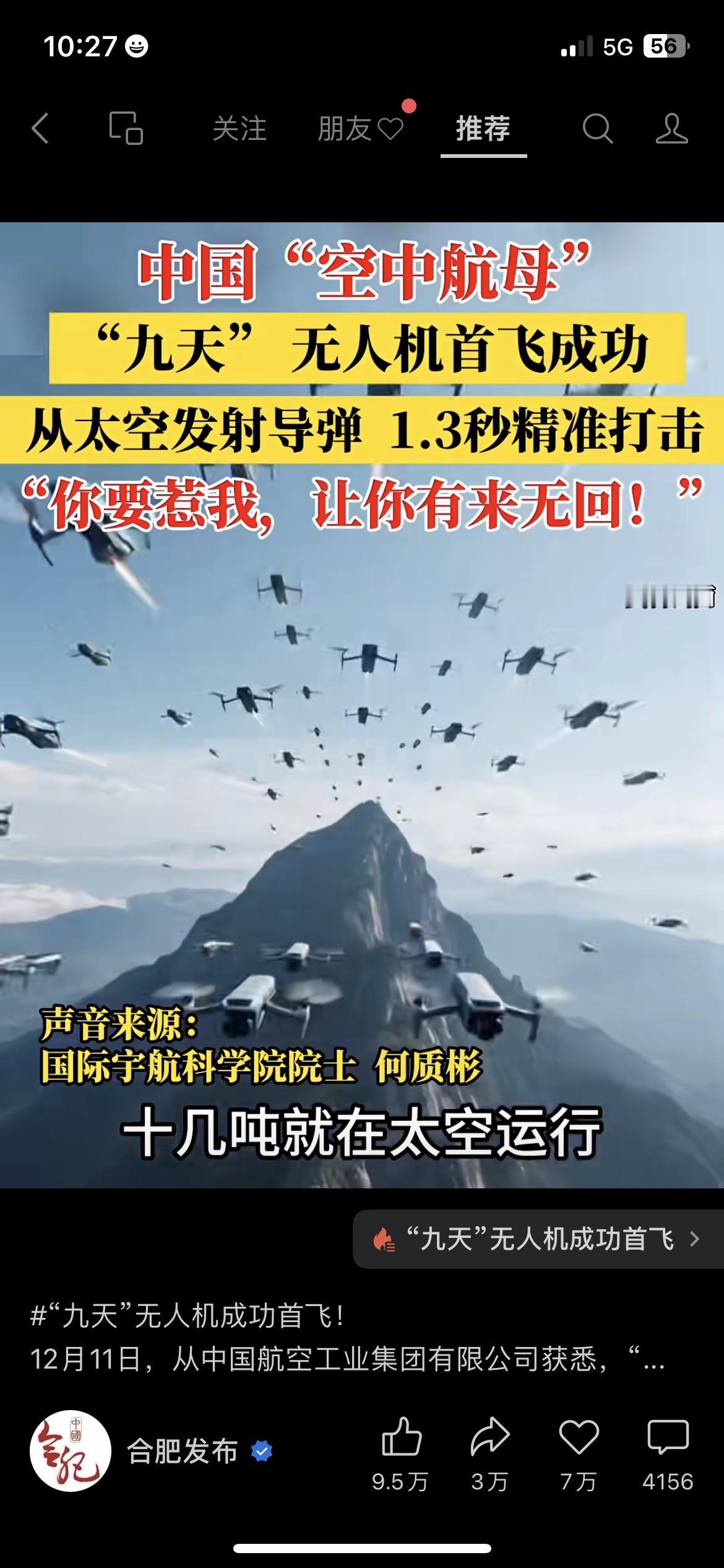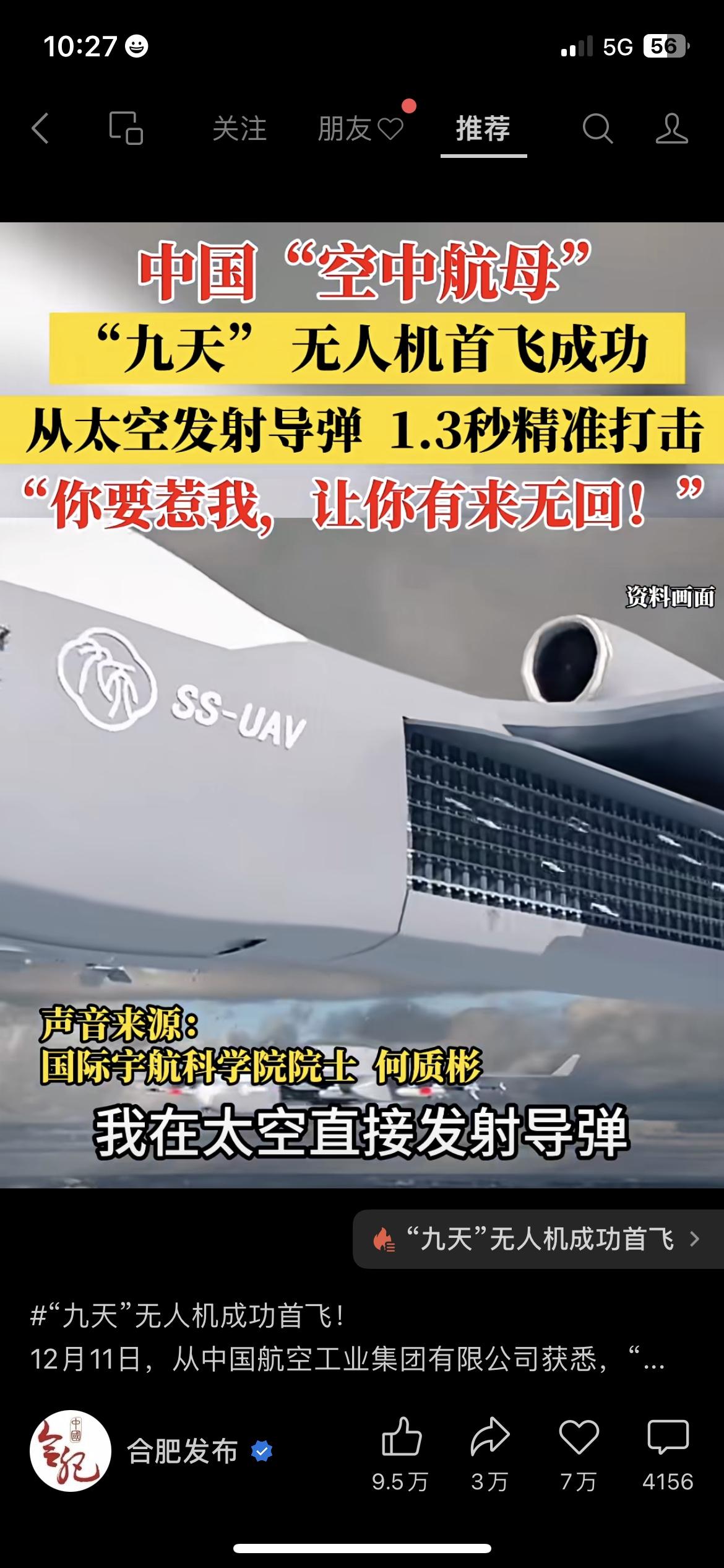 留心点!中国九天无人机首飞成功,咱国人都该知道这突破 平时关注军工科技的朋友,政务平台刚更新了九天无人机首飞的消息。 这款“空中航母”能从太空发射导弹,1.3秒精准打击,技术突破超亮眼。 想了解更多细节的话,可搜“合肥发布”官微看完整解读,其实很简单。 咱普通市民也能通过官方渠道追更军工进展,感受国家科技实力。 你对这款无人机最感兴趣的点是啥?评论区唠唠~九天无人机母舰 九天无人机