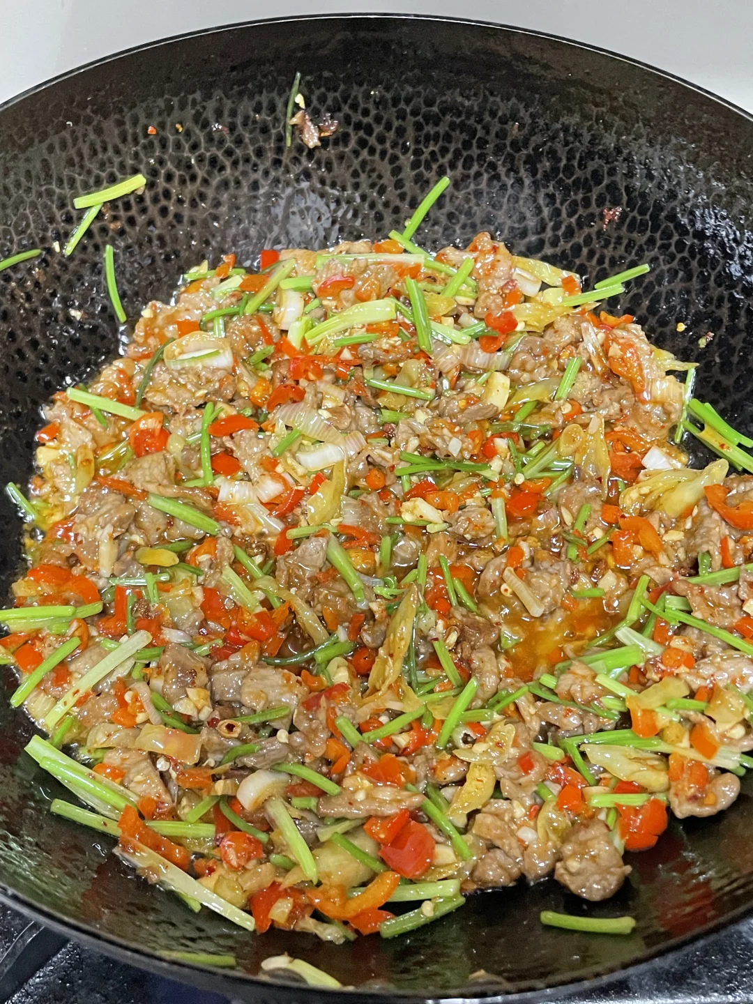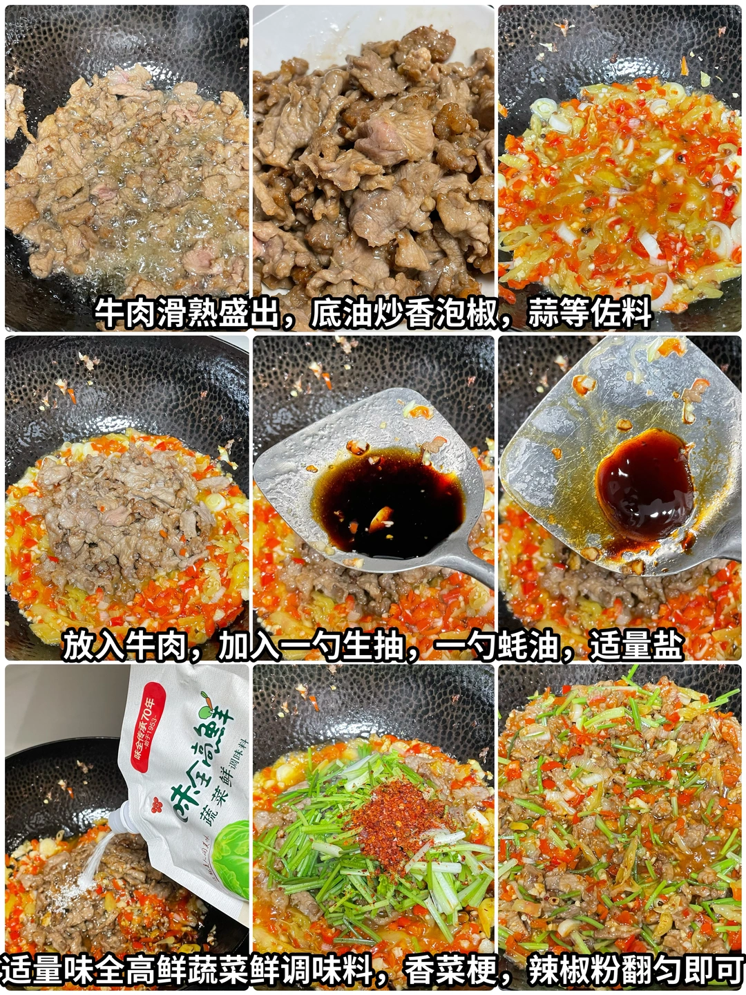 3⃣️ 起锅烧油,油热将牛肉快速滑熟,盛出留底油,将准备好的泡椒、小米辣、姜、蒜、花椒炒出香味,然后放入辣椒粉快速翻匀,加入牛肉来一点生抽和蚝油进行调味