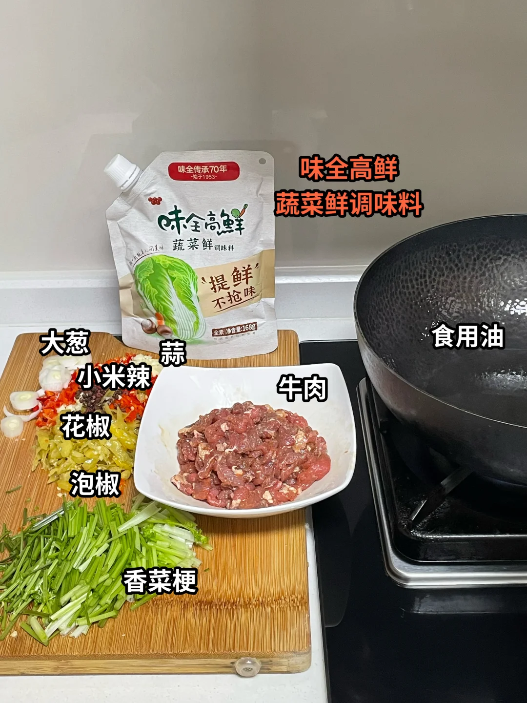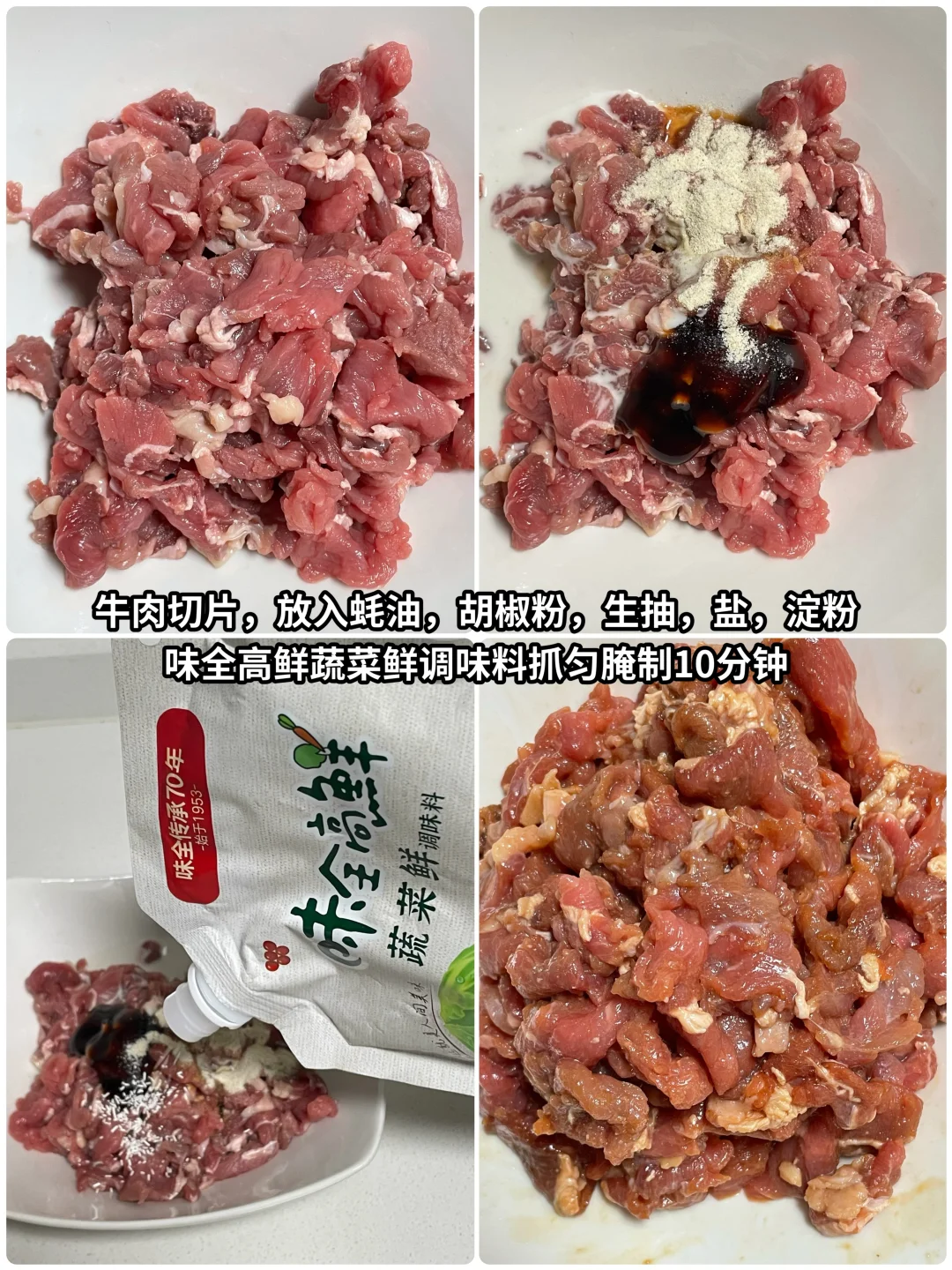 1⃣️ 将牛肉横向切小片,放入胡椒粉、蚝油、淀粉、生抽、味全高鲜蔬菜鲜调味料抓匀腌制10分钟。