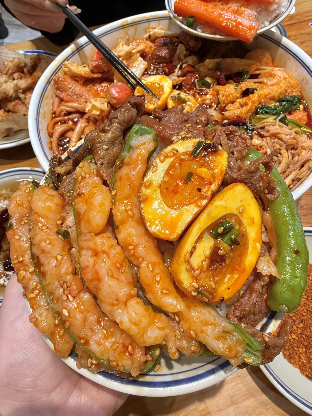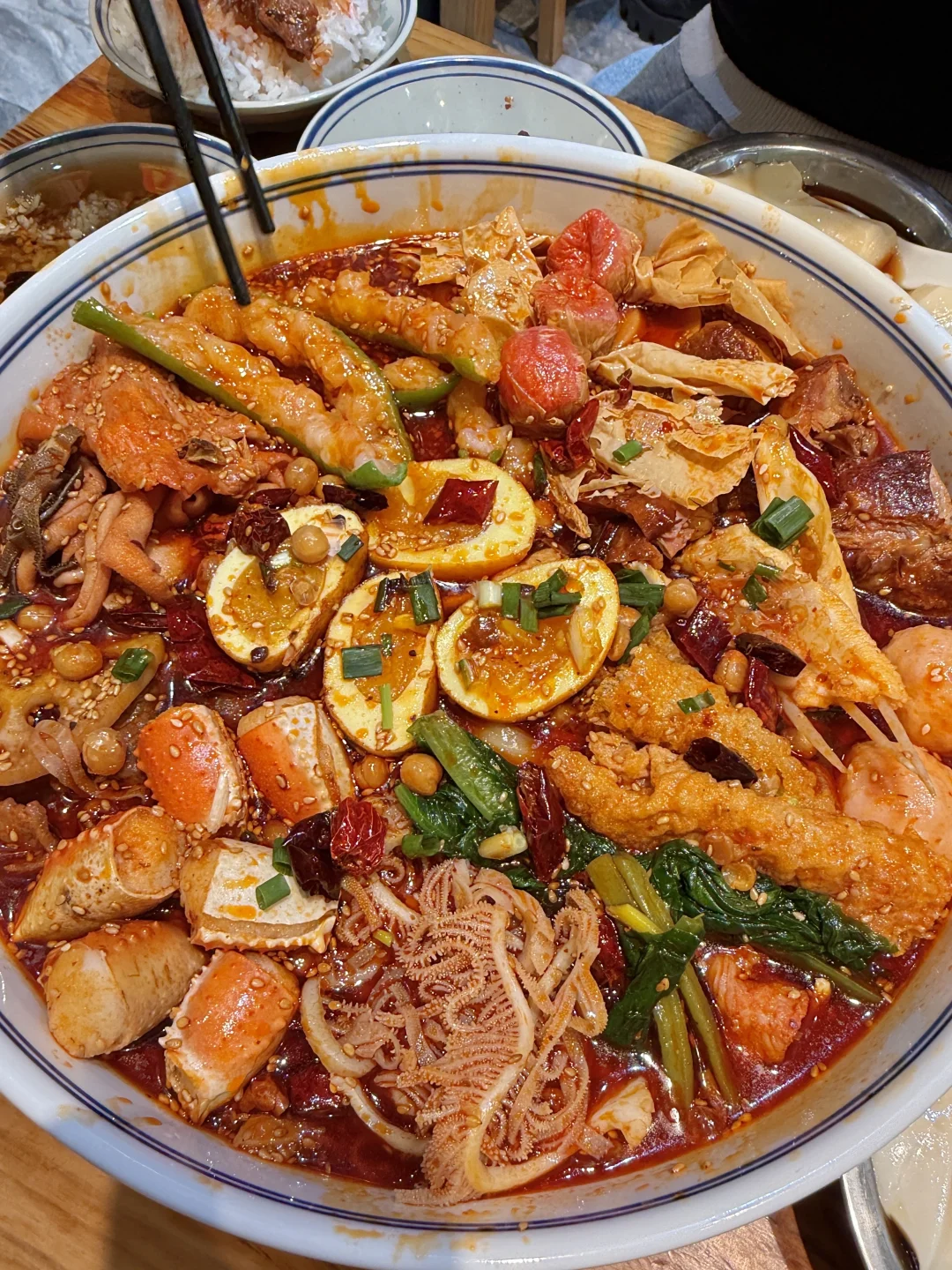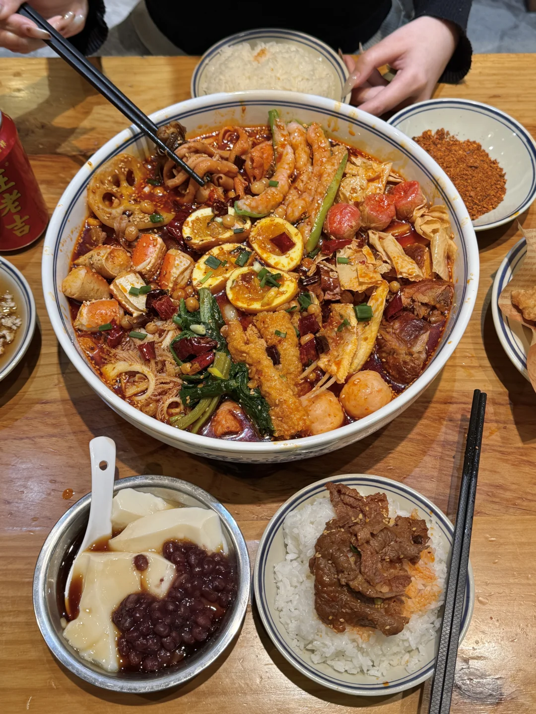 和朋友吃了好几次的社区冒菜!!好吃便宜份量大!很适合二人食! 就在滨江天街,人均几十吃个肚圆儿! 想不好吃啥的时候就会来吃这家! 我个人比较推荐:蟹柳、虎皮溏心蛋、青椒虾滑、千层肚、牛肉……还有咸蛋黄虾丸一口爆浆!再加份泡面裹上红油,太幸福了!! 还可以点干碟和秘制油碟,蘸鸭肠牛肉和脆皖鱼骨更香了! 小酥肉和老妈蹄花汤我每次必点,很接近当地的味道!太辣就吃碗红糖冰豆花解解腻~