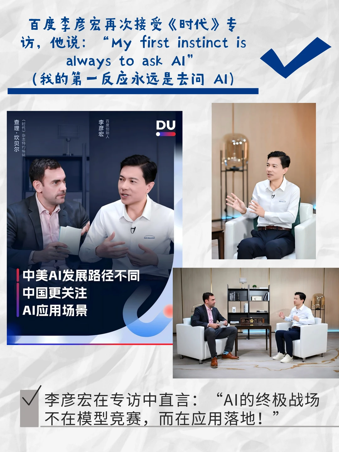 当OpenAI、谷歌追逐通用人工智能(AGI)的星辰大海时,百度李彦宏在《时代》专访中说:“AI的终极战场不在模型竞赛,而在应用落地!”这不是保守,而是基于中国产业现实的清醒判断——我们有全世界最复杂的供应链、最丰富的场景,AI必须“有用”才能创造价值。