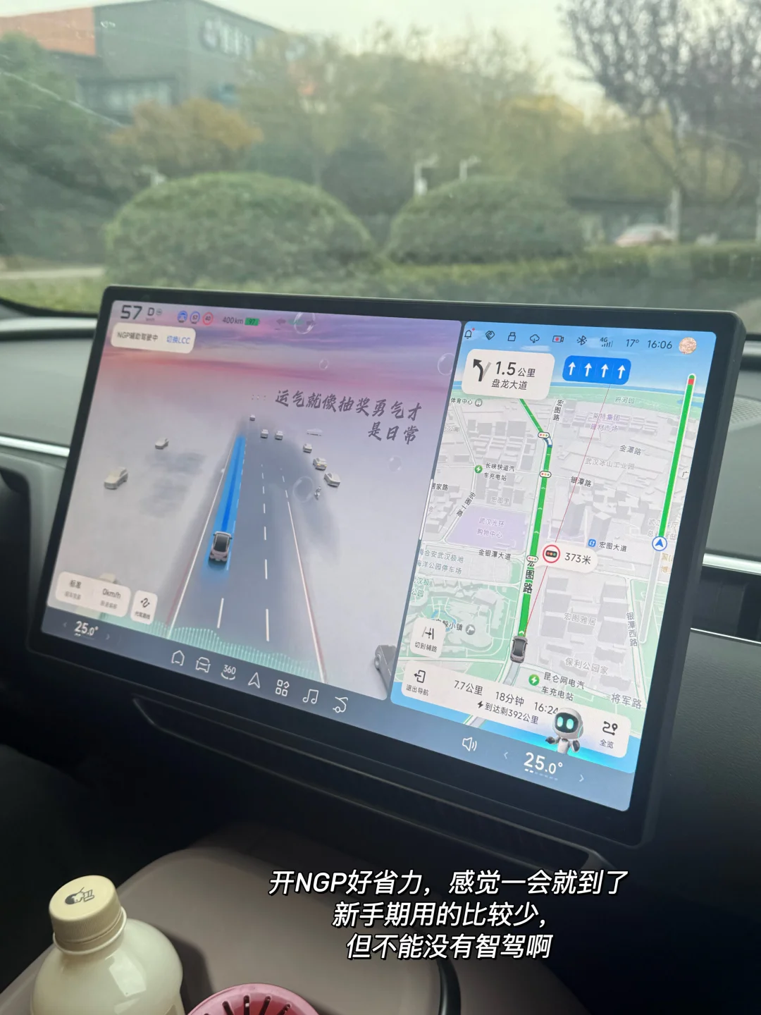 智能辅助驾驶在新手期用的比较少,但不能没有,刚开始NGP时容易偏右开,升级了几个版本觉得还行。目前只在高速和高架桥开了NGP,很省力。