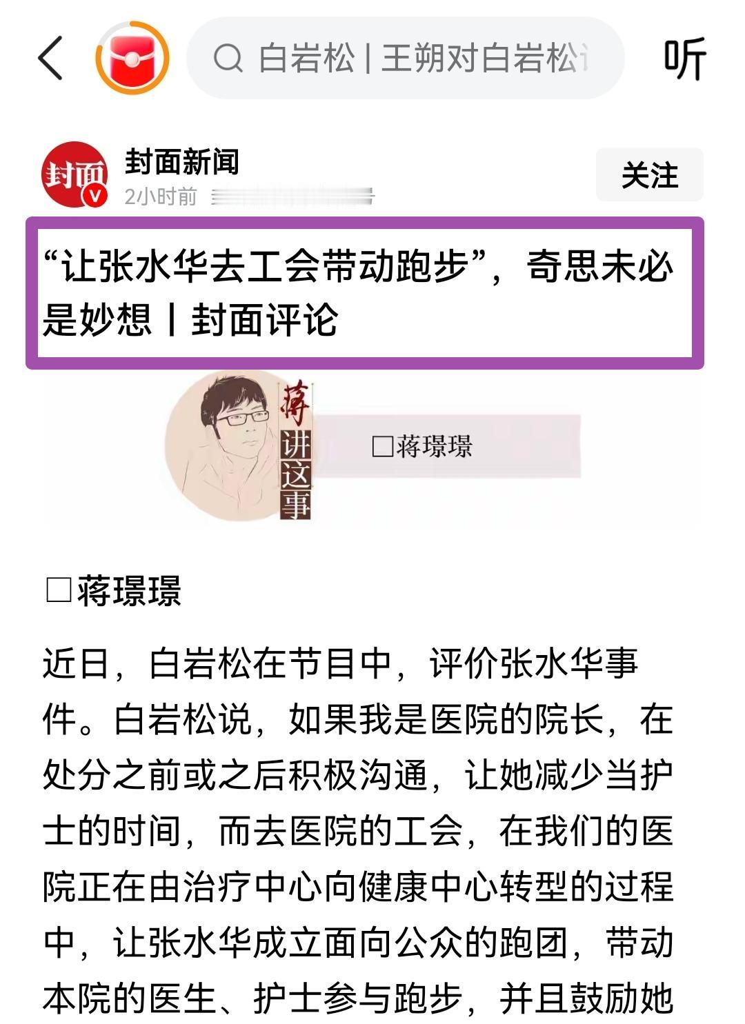 让违规的护士转岗去工会带跑团?这主意听着挺巧妙,实际上是典型的和稀泥。张水华的主要问题是岗位失责,不是职业与兴趣不兼容。白岩松的提议,看起来给了台阶,实际上绕开了违规该怎么罚的问题,用一个看似双赢的方案,模糊了职场的权责边界。 医院不是兴趣孵化园,岗位安排得讲规矩、论公平。今天能为一个最快护士开特例,明天就会有无数人质疑:凭什么兢兢业业守规矩的人要苦守岗位,不守规矩的反而能换个轻松差事? 所谓的转型、创新,从来都不能凌驾于规则之上。少来些脱离现实的“提议”,多守守职场的基本规则,才是正经事!