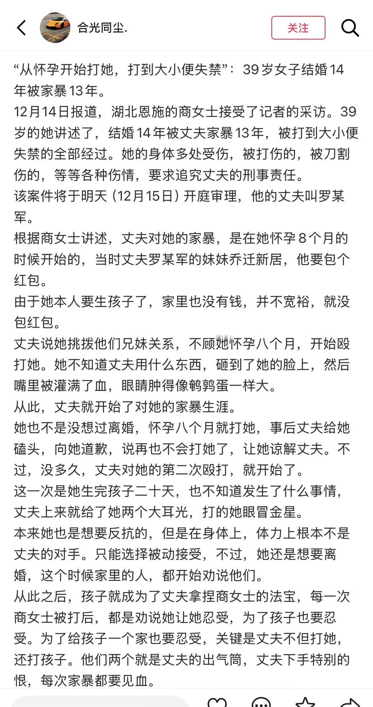 “不是不想逃,是根本逃不掉”,39岁的商文娟一句话道出为啥家暴不离婚。 39岁的商文娟在14年婚姻中遭遇13年家暴,全身遍布刀割伤痕、被打到大小便失禁甚至确诊甲状腺癌晚期。 当大家都纷纷质疑她为什么不离婚时,无法挣脱的生存枷锁将她牢牢锁住。 1、丈夫完全掌控家庭收入,商文娟连就医费用都要乞求对方同意,没有工作离婚后无力承担租房、孩子教育基本生存,也没有强大的娘家能给她托底。 2、近20次报警,换来的多是“夫妻吵架好好沟通”的调解,丈夫甚至当着她单位领导面施暴使她失禁,工作人员甚至反问她“你就没一点错吗”,人身保护令挡不住变本加厉的暴力。 3、丈夫以“敢离婚就抢走孩子”威胁,商文娟12岁儿子跪地求情反遭耳光。 现实里,家暴受害者的逃离,远不是一句“提离婚”就能解决的。各种现实阻碍共同织成了一张密不透风的网,将受害者困在其中。 我们不该站在道德高地上苛责“为什么不反抗”,而该静下心来追问:当受害者鼓起勇气求助时,我们的社会有没有及时递上足够坚实的支撑? 所幸,商文娟最终带着孩子挣脱了深渊,还毅然决然地追究施暴者的刑事责任。这背后,固然离不开受害者自身的莫大勇气,但更离不开制度的有力托底。 反家暴法绝不能停留在纸面上,人身保护令要做到“裁而能执”,基层机构要彻底摒弃“和稀泥”的敷衍心态,整个社会更要给予受害者多一份包容理解,少一份指指点点。 家暴从来不是“家务事”,而是板上钉钉的违法行为。当我们再看到类似新闻时,少一些“何不离婚”的轻飘飘质问,多一些“如何帮她”的实打实行动,才能让更多深陷泥沼的受害者,有勇气冲破黑暗,寻到属于自己的那束光。