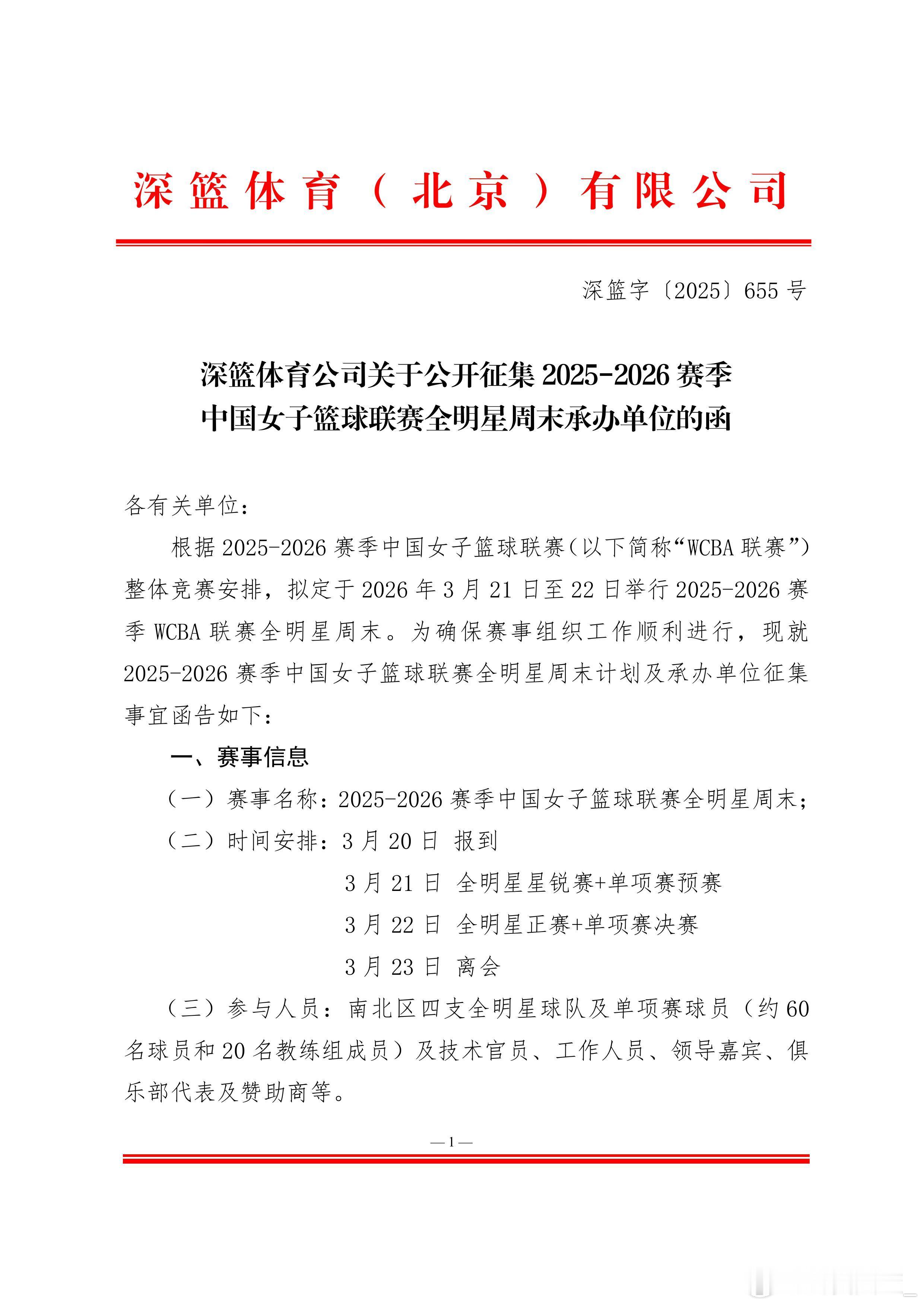 深篮体育发布公告,公开征集2025-2026赛季WCBA联赛全明星周末承办单位。相关文件透露,本赛季的全明星周末是WCBA历史上的第20届全明星周末,计划于2026年3月21日-22日举行。过去四届全明星周末分别在成都(2021.12)、深圳(2023.2)和杭州(2024.3/2025.2)三座国内一线城市&新一线城市举办。