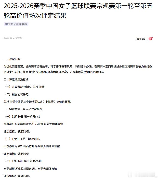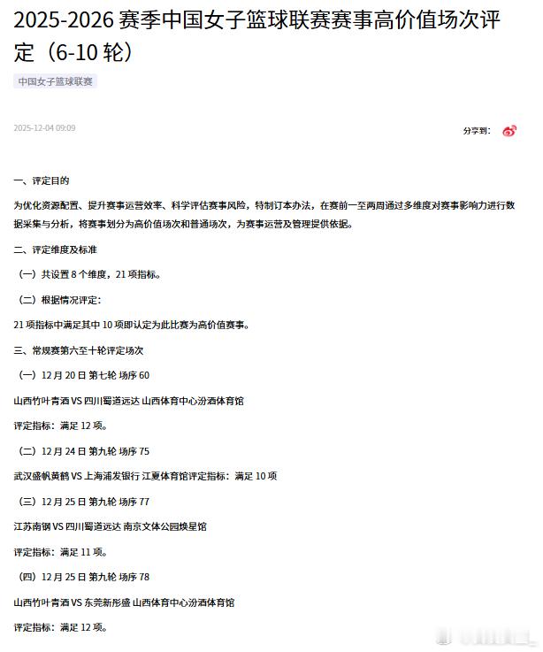 【WCBA榜首之争现绝平,详解联赛“高价值场次”】联赛第五轮,上赛季冠军广东女篮和亚军四川女篮直接对话,一场关乎榜首的强强之争成为联赛开赛以来关注度和讨论度最高的比赛。探营wcba球队 这场比赛的过程可谓一波三折,客场作战的四川女篮进入状态更快,很快便建立起两位数左右的优势,并带着9分的优势进入中场休息。第三节比赛,广东队全员手感复苏,分差被不断缩小,随着钟佳丽在第三节末端的三分命中,广东女篮反超了比分,并逐渐建立起安全的比分优势。 四川女篮也没有束手就擒,田媛媛在常规时间最后一刻命中压哨绝平进球,奇迹般地将比赛拖入加时。加时赛中,坐镇主场的广东女篮发挥更为稳定,她们的团队配合流畅,关键机会把握性也更强,最终以83-75的比分带走胜利。 比赛只是一方面,我爱女篮更想和大家分享的是“高价值场次”的概念。这个赛季,联赛引入“高价值场次”的概念,会以五轮为一个阶段,提前公布高价值场次的具体场次。联赛前五轮有哪几场被列为高价值场次的呢?答案是一共三场(图1),分别揭幕战广东vs江苏、第二轮山东vs山西,以及上文提到第五轮进行的榜首之争广东vs四川。事实证明,这三场比赛打的也都非常精彩。 关于高质量场次的评定标准(图3、图4),联赛方面介绍称,共设置 8 个维度、21 个指标,满足其中10项指标的比赛即认定为高价值场次。对于满足条件的高价值场次,联赛会选派至少两名A档裁判员、会选派比赛监督/竞赛巡视员赴现场工作、还会加大宣传力度及商务资源,从多方面为赛事保驾护航。 日前,联赛方面也公布了WCBA常规赛第6轮-第10轮的高价值场次评定结果(图2),第七轮山西vs四川、第九轮武汉vs上海、第九轮江苏vs四川以及第九轮山西vs广东共四场比赛入选。欢迎大家在评论区留言互动,看看联赛前五轮还有哪些让你印象深刻的“高价值场次”?