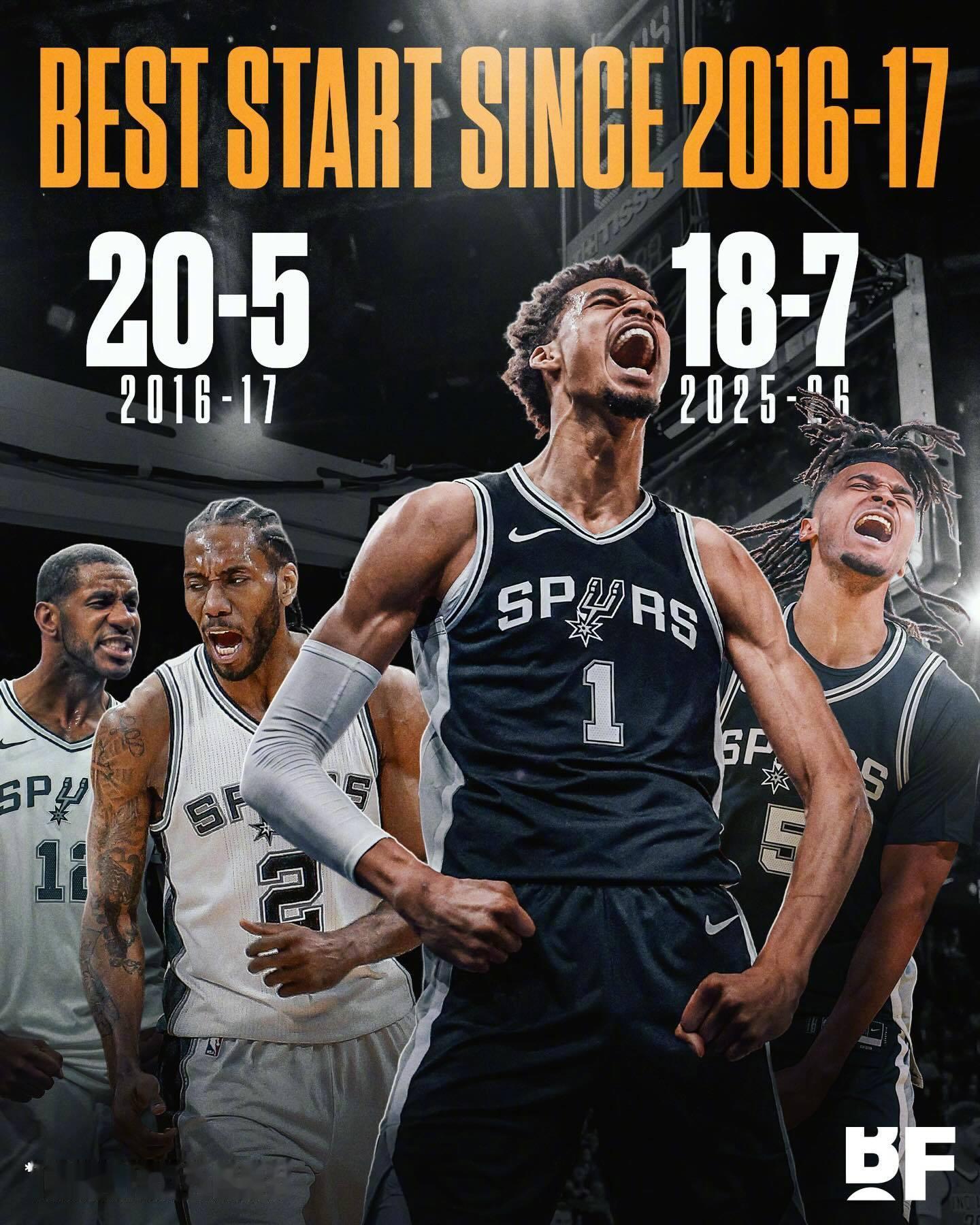 马刺目前战绩为18胜7负,球队也打进了本赛季的NBA杯决赛。18胜7负是马刺自16-17赛季以来取得的最佳开局战绩。当年那支马刺最终拿到了61胜21负的战绩。而当时那支马刺还是由莱昂纳德、大加索尔、帕克、吉诺比利还有阿尔德里奇领衔。