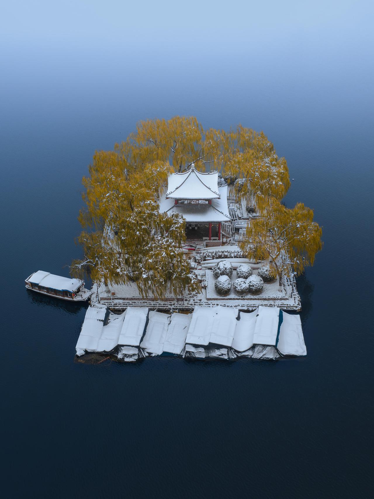 雪落湖心岛,金柳裹银装,一方小亭,守着冬日里的静谧温柔。 晨雾似轻纱漫过墨色湖面,将这方小小岛屿拥入怀中。 覆雪的亭檐弯出温润的弧度,红柱在白与金的交织里添了一抹暖,金黄的柳丝凝着碎雪,像缀了满身的星子。 岸边木舟覆着雪衾静静泊着,连风都似不忍惊扰,只轻轻拂过,让雪粒从枝头簌簌落下,在这水天之间,酿出一场独属于冬日的清宁与诗意。