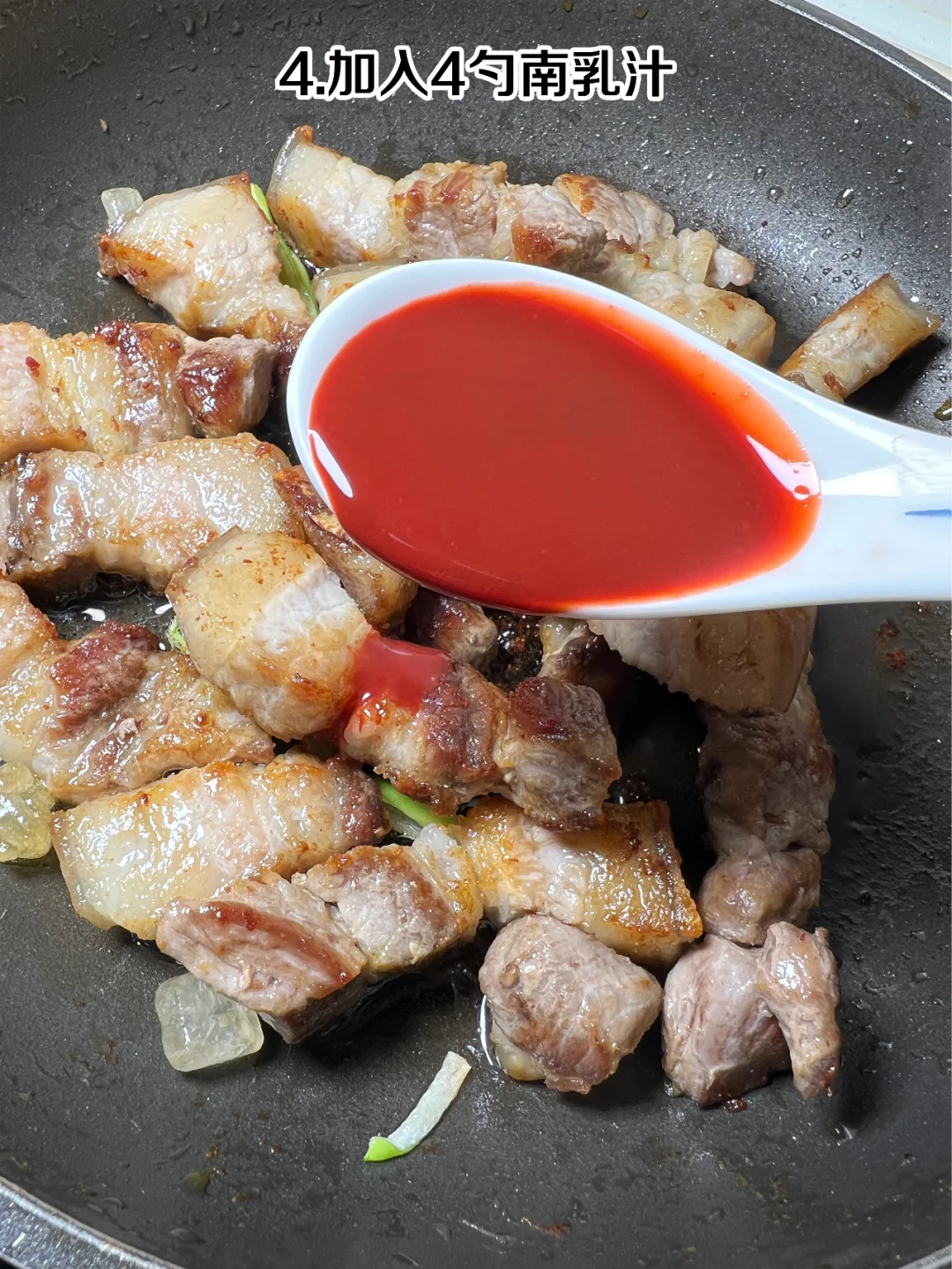 超级下饭的家常菜 腐乳肉,肥而不腻,唇齿留香,谁吃谁迷糊![色色R] [派对R]步骤: 1.五花肉清洗干净后切块 2.将五花肉放入锅内小火慢煎,煎至出油,五花肉两面金黄 3.油太多了可以倒出部分油,留底油爆香葱段姜片,根据喜好加入适量冰糖 4.加入4勺南乳汁 5.加水沫过五花肉 6.大火烧开后转小火炖40分钟左右,喜欢软烂的可以时间长点 7.最后大火收汁就OK啦[得意R](建议稍微留点汤汁,拌饭吃超级香![赞R][赞R][赞R])