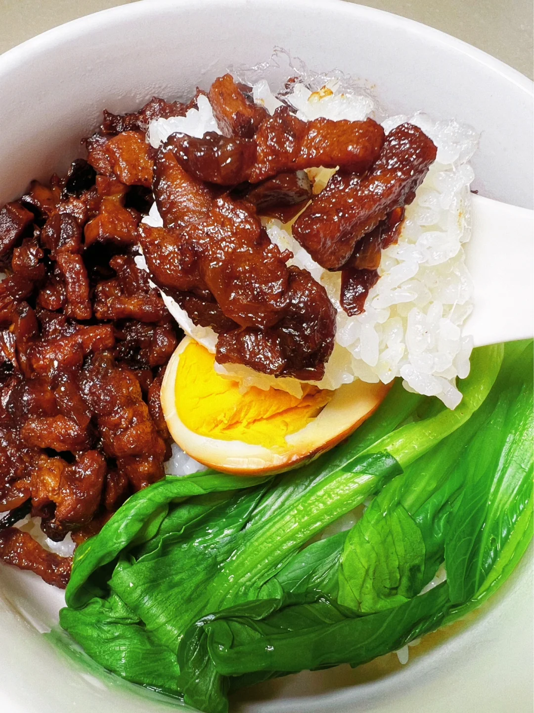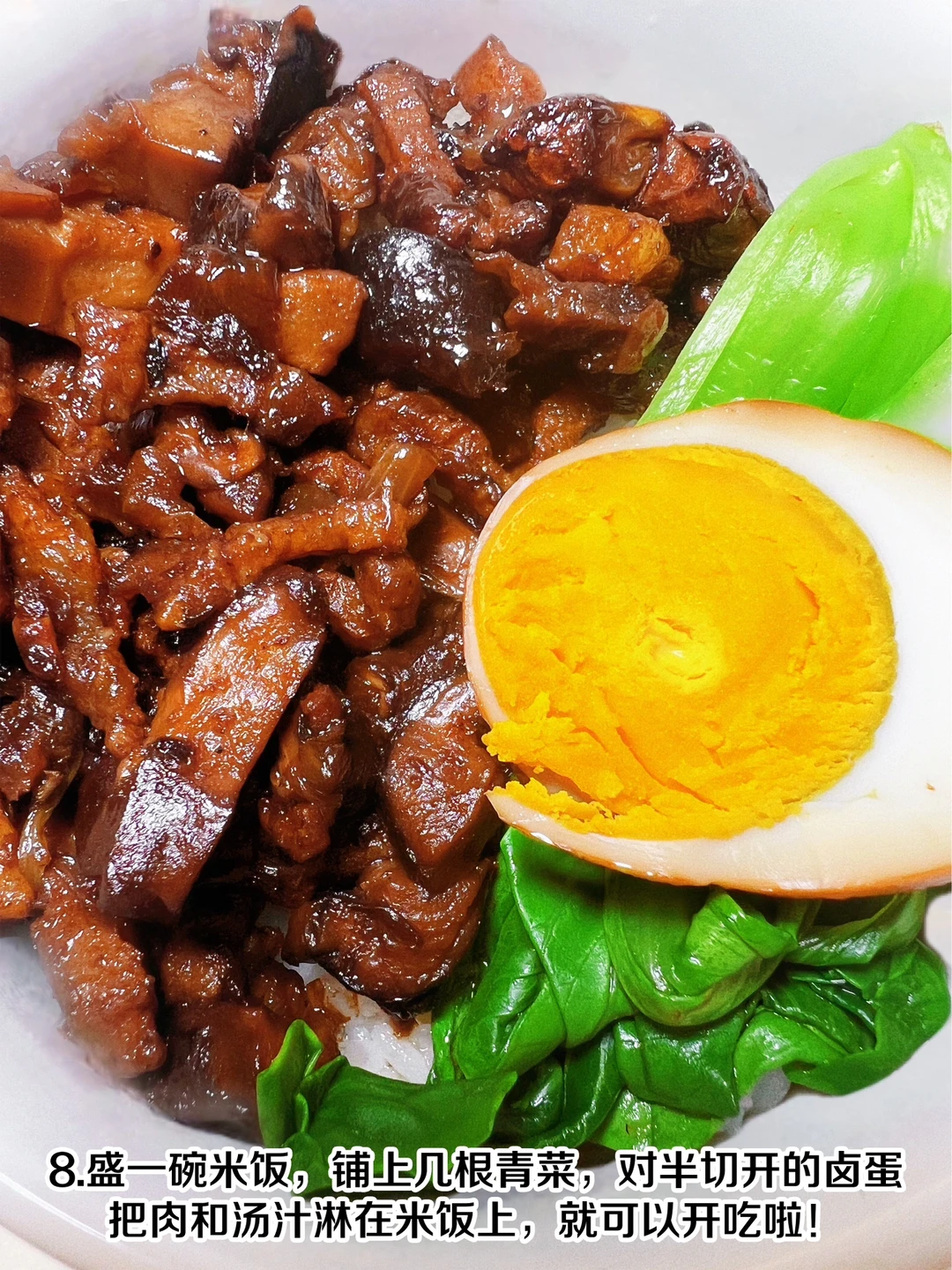 8、盛一碗米饭,铺上几根青菜,对半切开的卤蛋,把肉和汤汁淋在米饭上,就可以开吃啦!