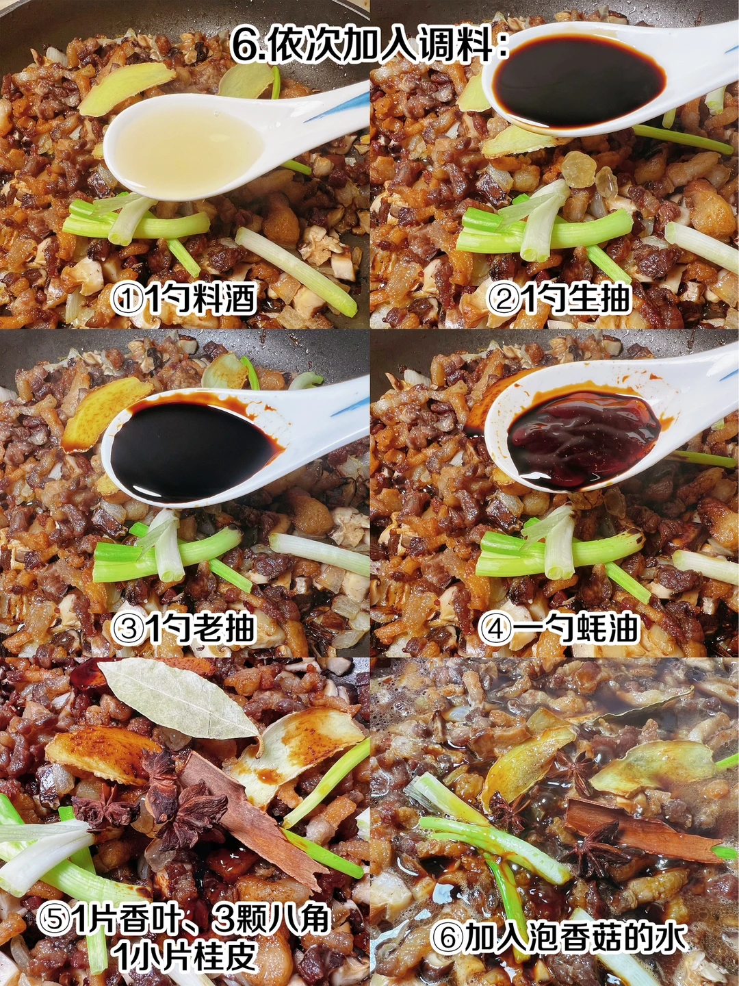 6、依次加入调料:1勺料酒、1勺生抽、1勺老抽、一勺蚝油、1片香叶、3颗八角、1小片桂皮,加入泡香菇的水。