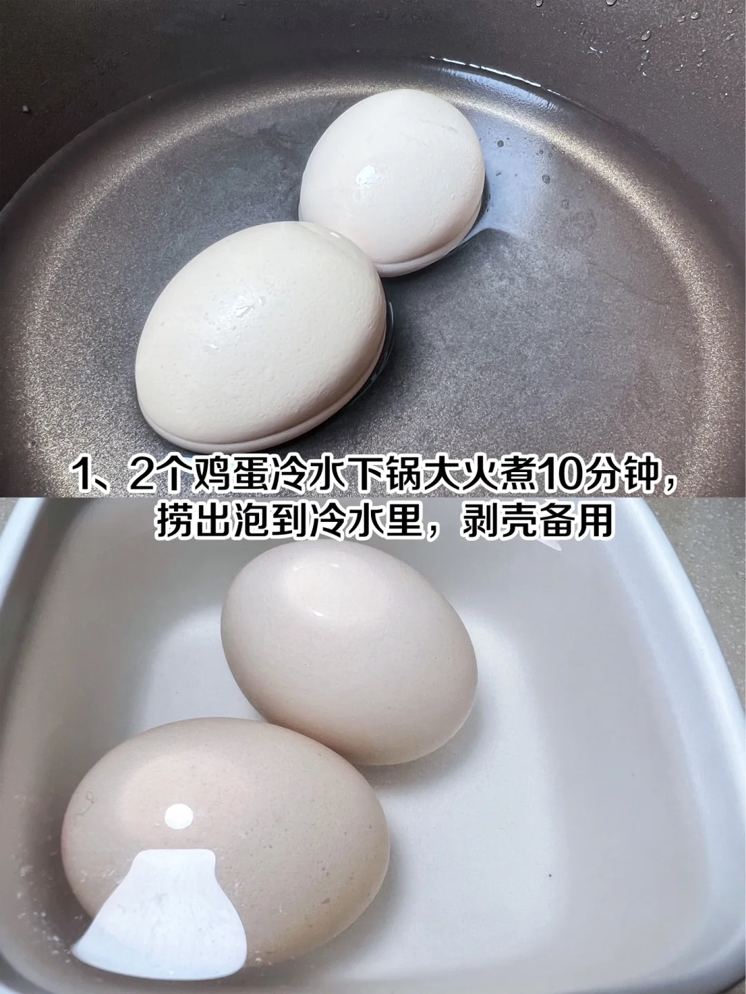 1、2个鸡蛋冷水下锅大火煮10分钟,捞出泡到冷水里,剥壳备用。