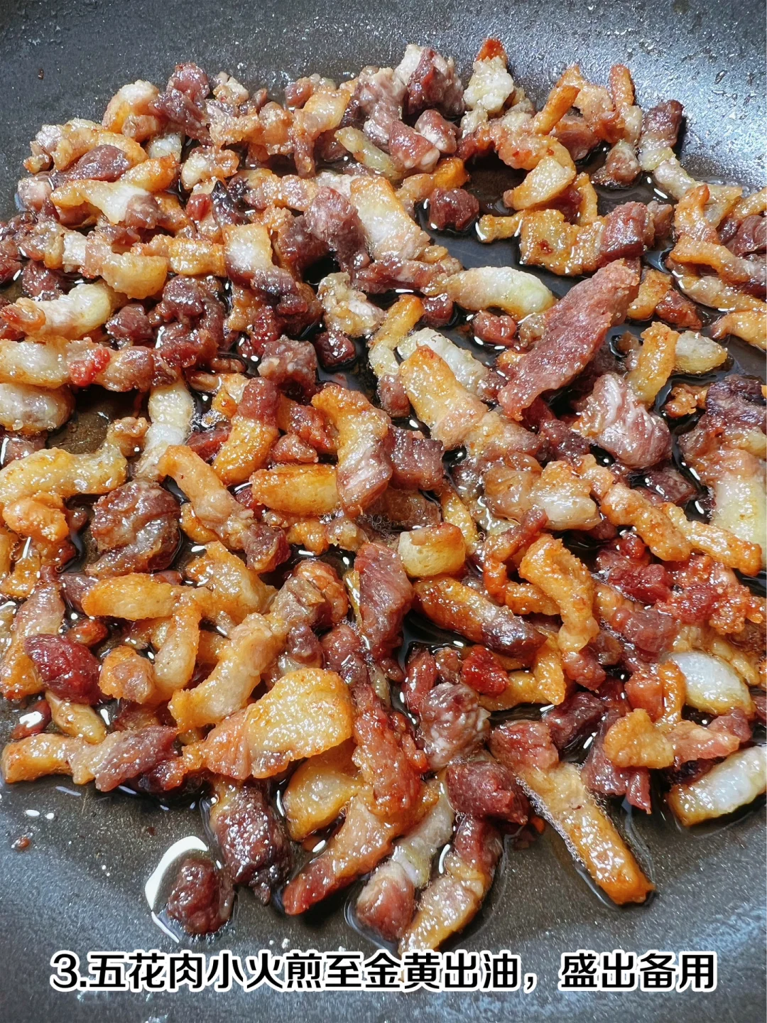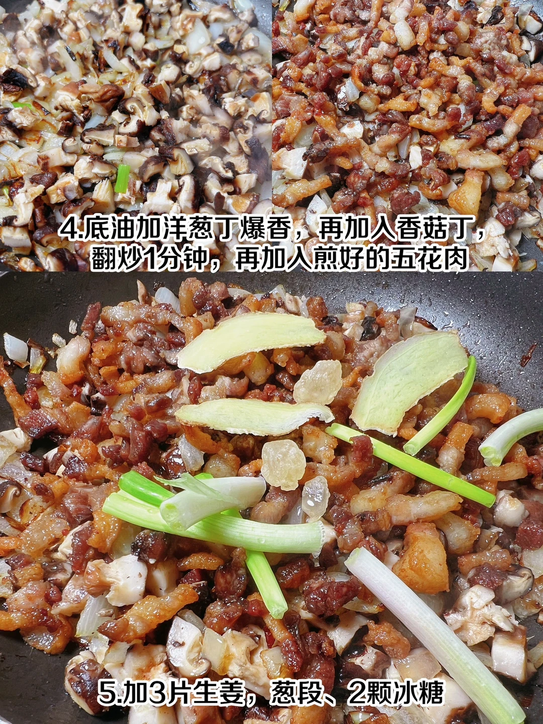 4、底油加洋葱丁爆香,再加入香菇丁,翻炒1分钟,再加入煎好的五花肉。