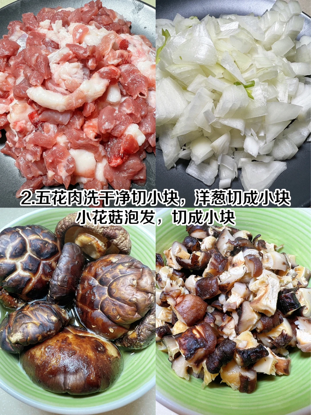2、五花肉洗干净切小块,干香菇泡发,切成小块。洋葱切成小块。