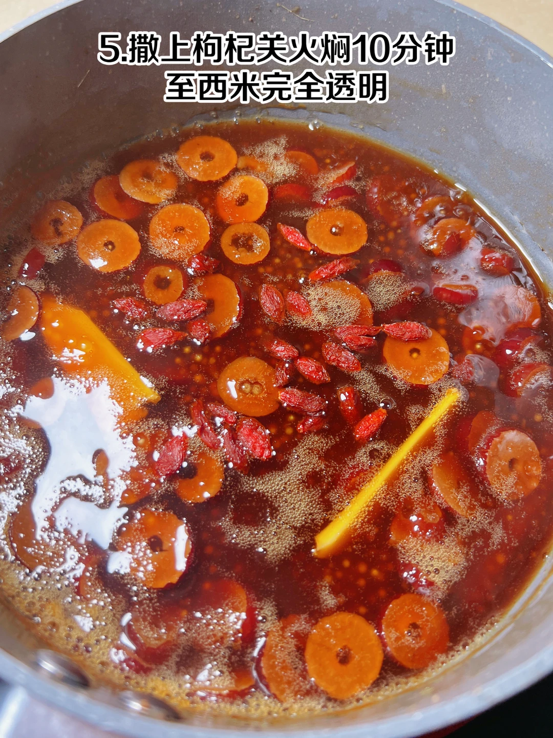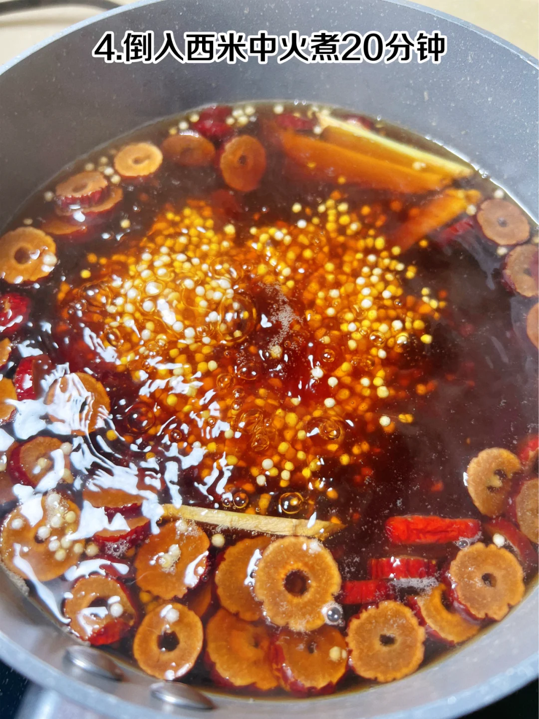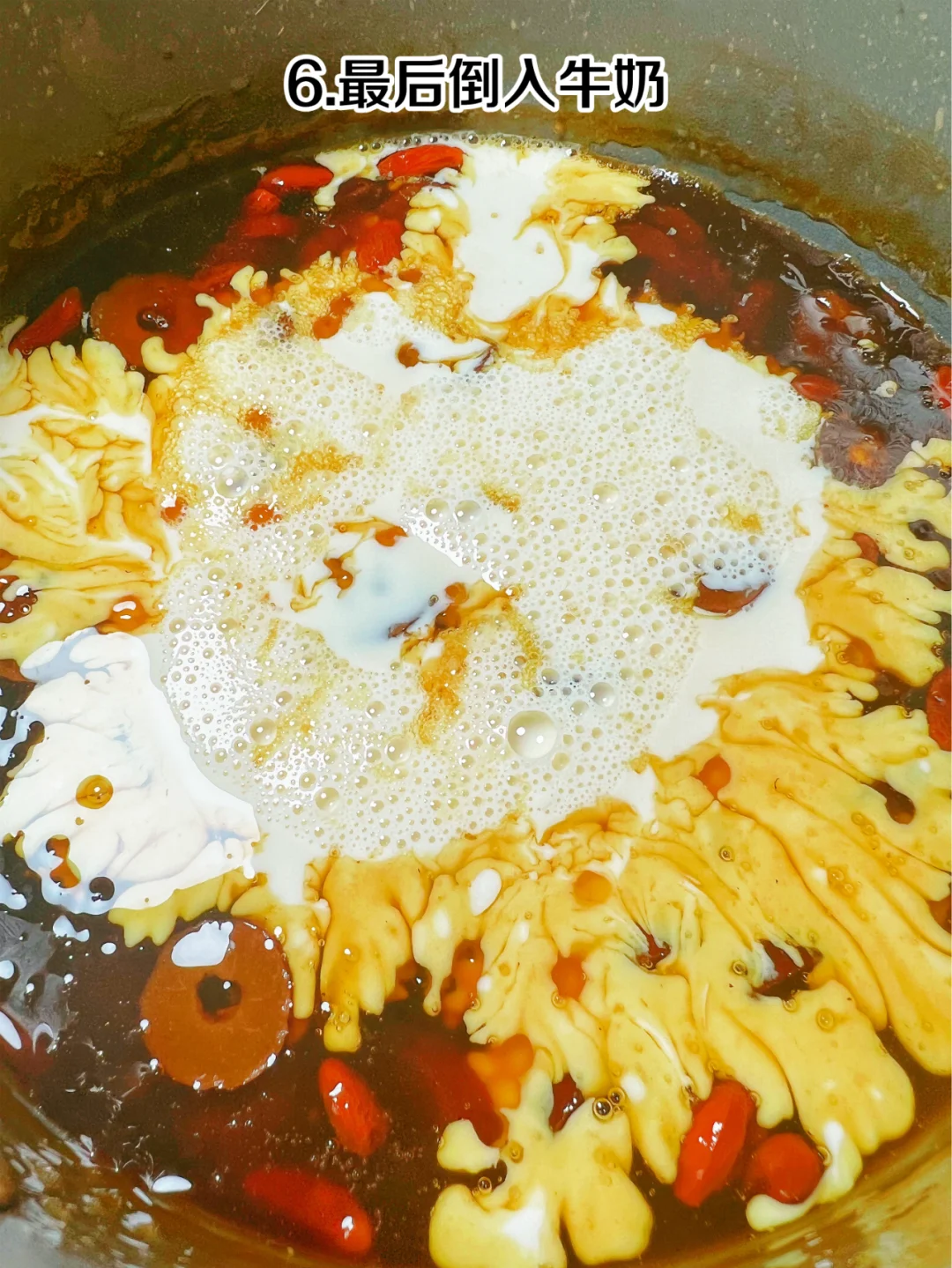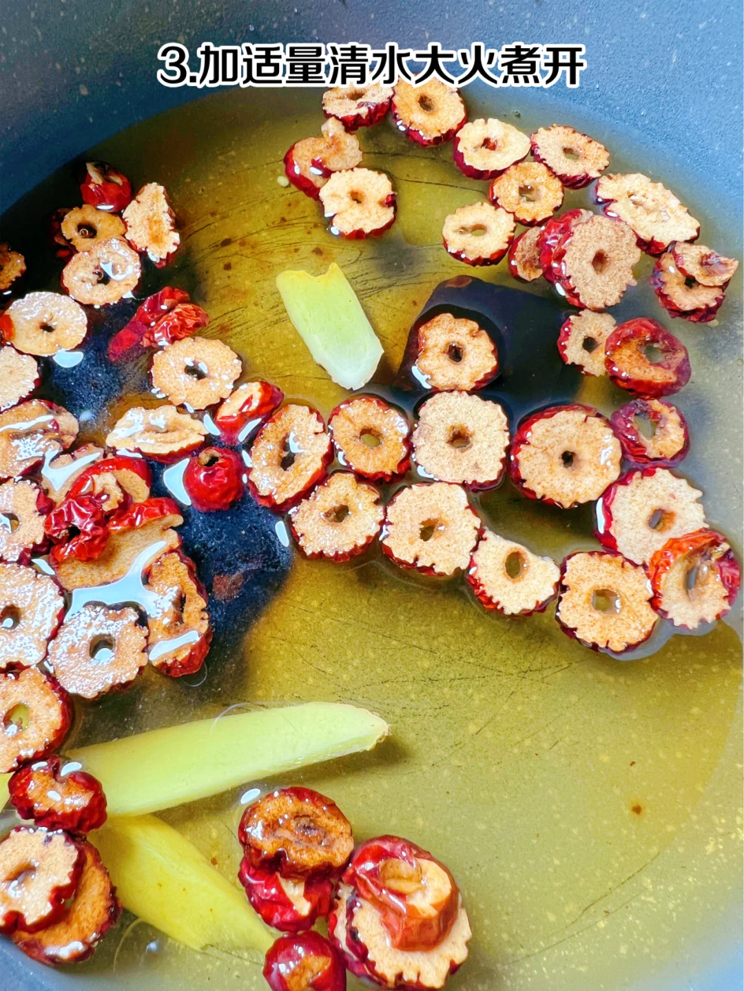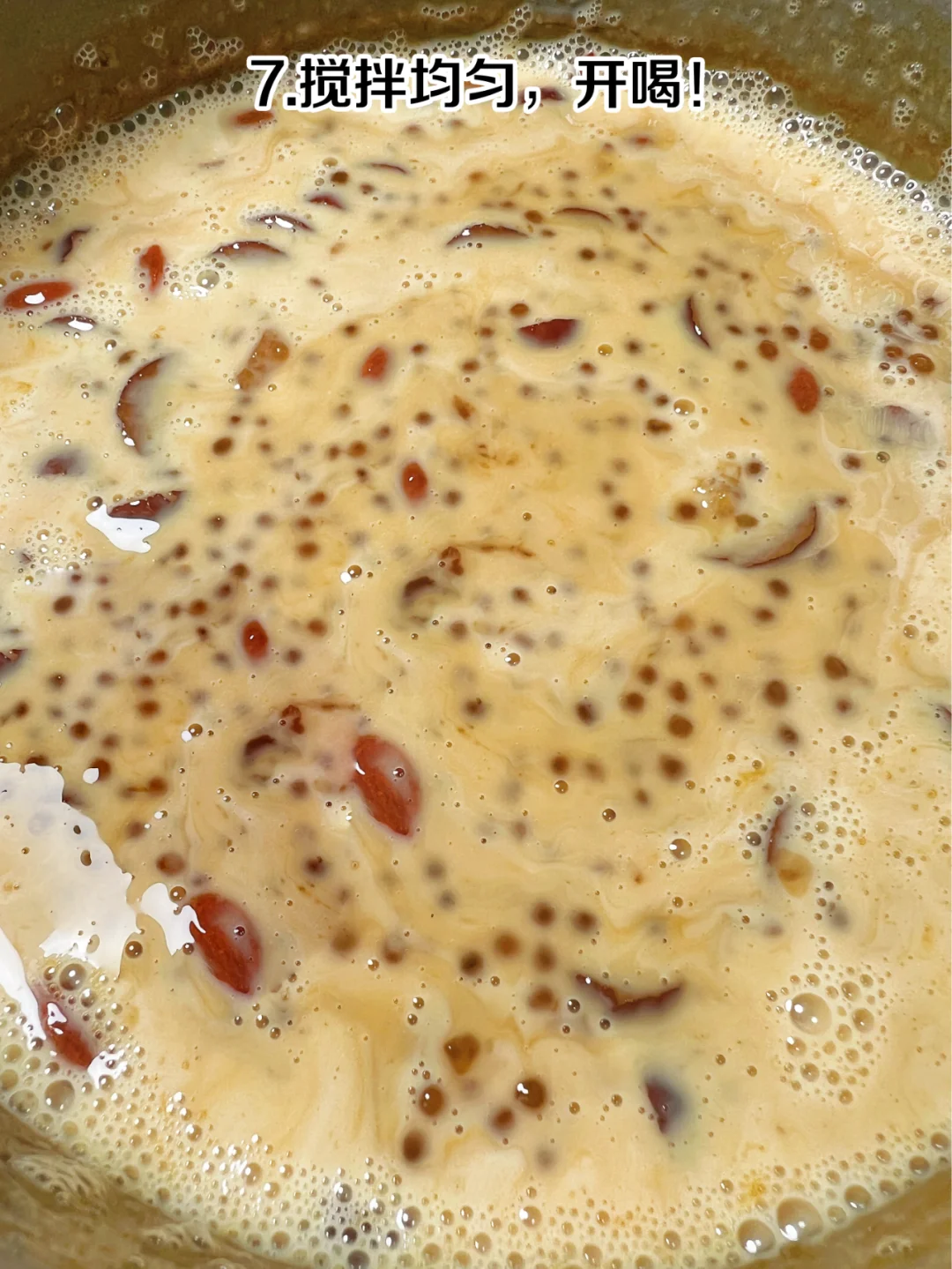 自制神仙饮品 红糖姜枣西米露 冬日热饮红糖姜枣西米露,暖宫又养颜,快[派对R]步骤 1、准备食材:姜片、红糖、红枣、枸杞、西米 2、将姜片、红枣、红糖放入锅中 3、加适量清水大火煮开 4、倒入西米中火煮20分钟 5、撒上枸杞关火焖10分钟至西米完全透明 6、最后倒入牛奶 7、搅拌均匀,开喝[得意R] 红糖姜枣西米露喝起来奶香浓郁,有红枣的清香,西米Q弹顺滑,比奶茶好喝一百倍[色色R] 建议女生把奶茶都换成它,真滴是既好喝又养气色,
