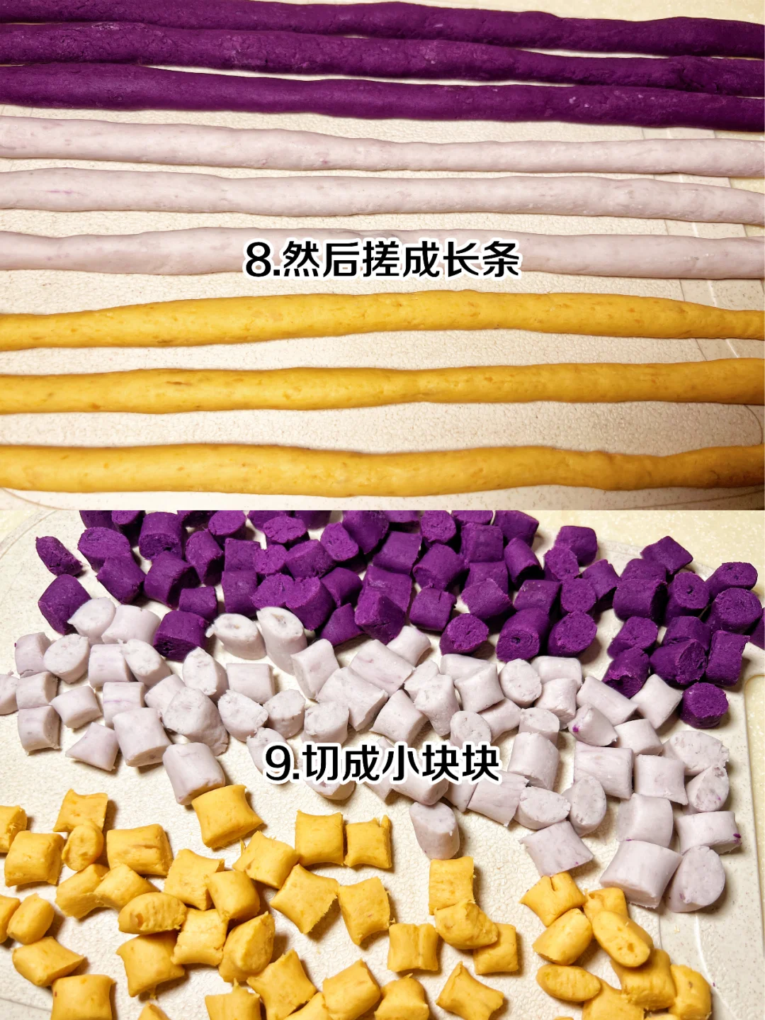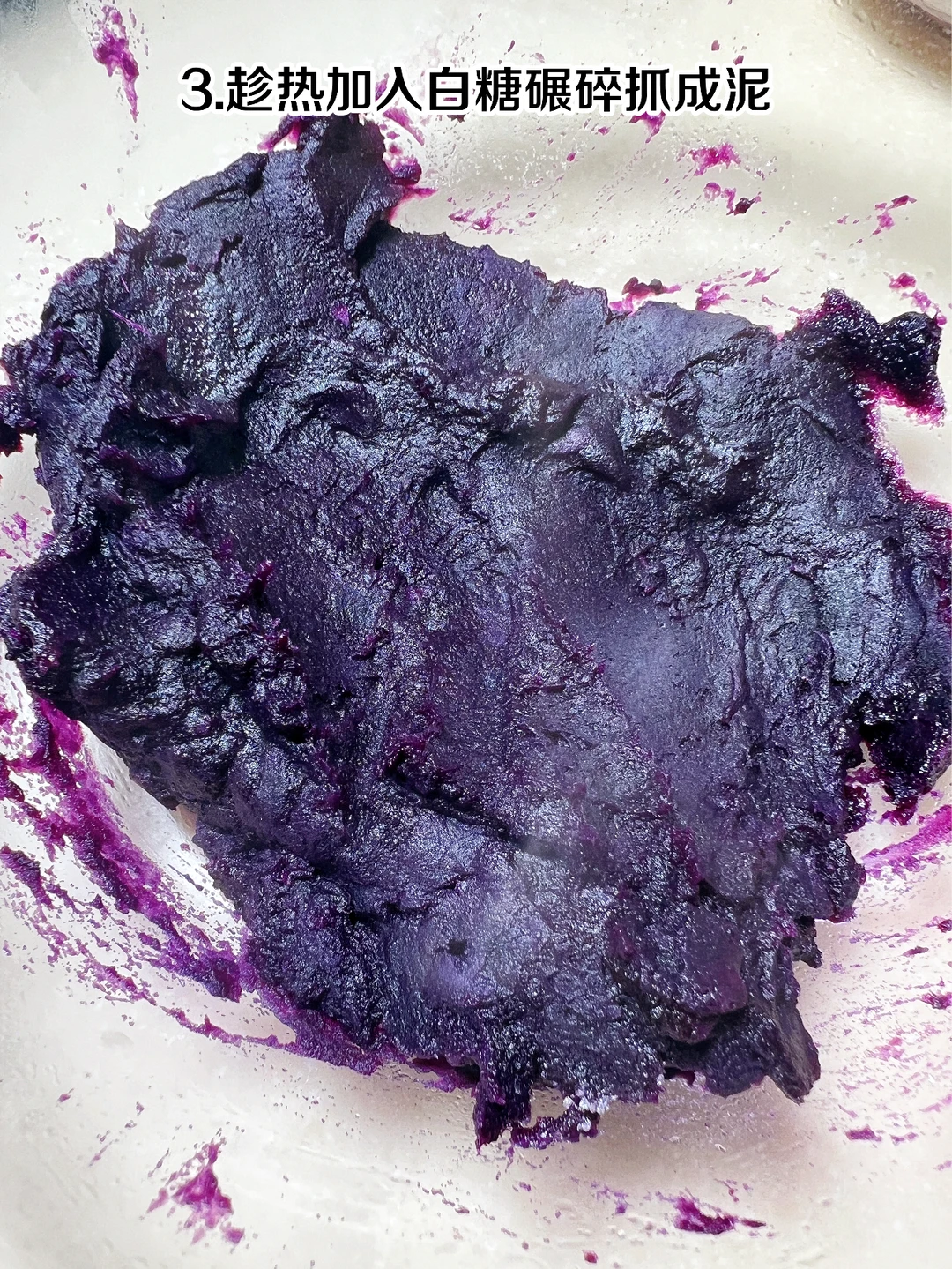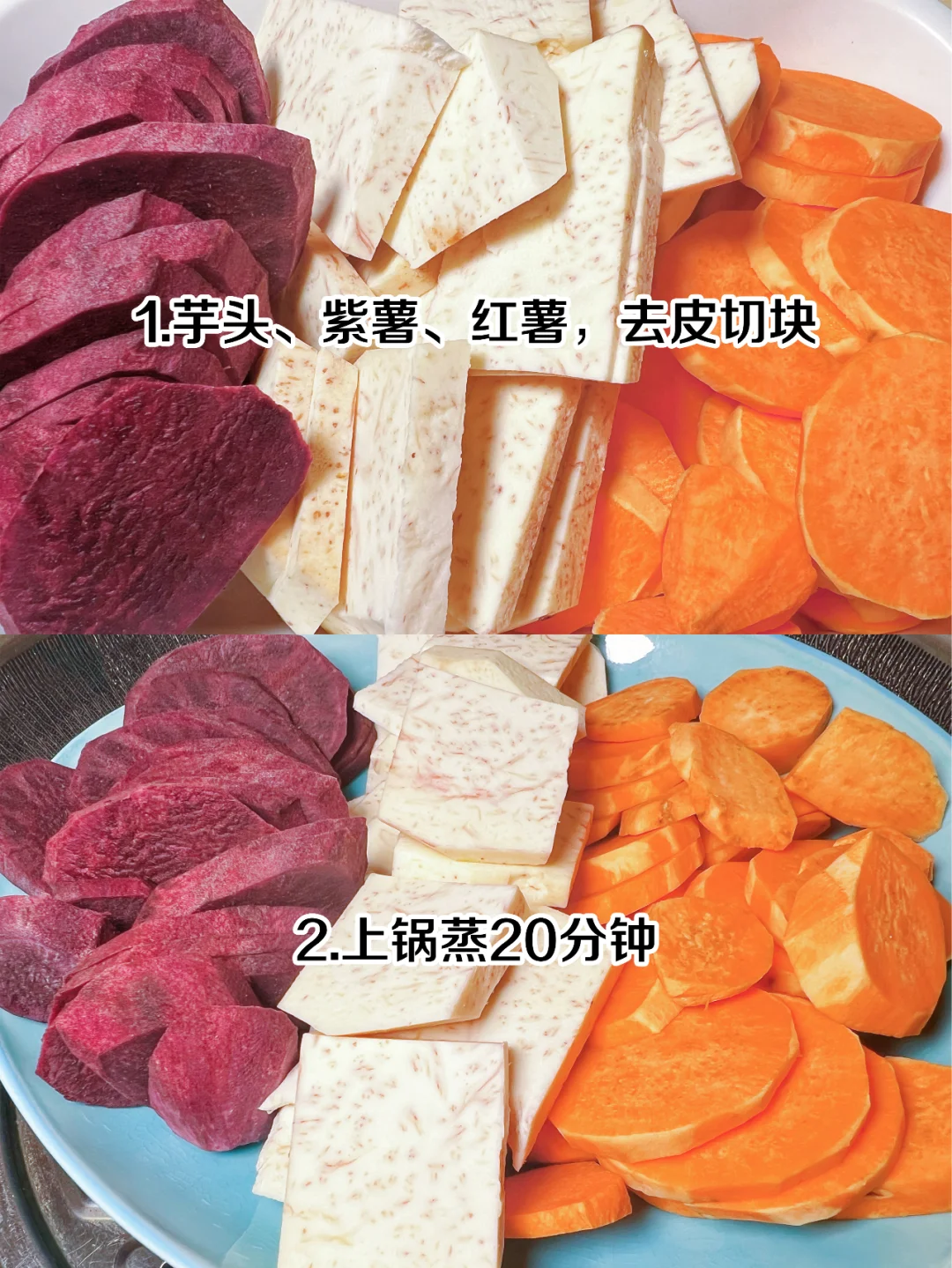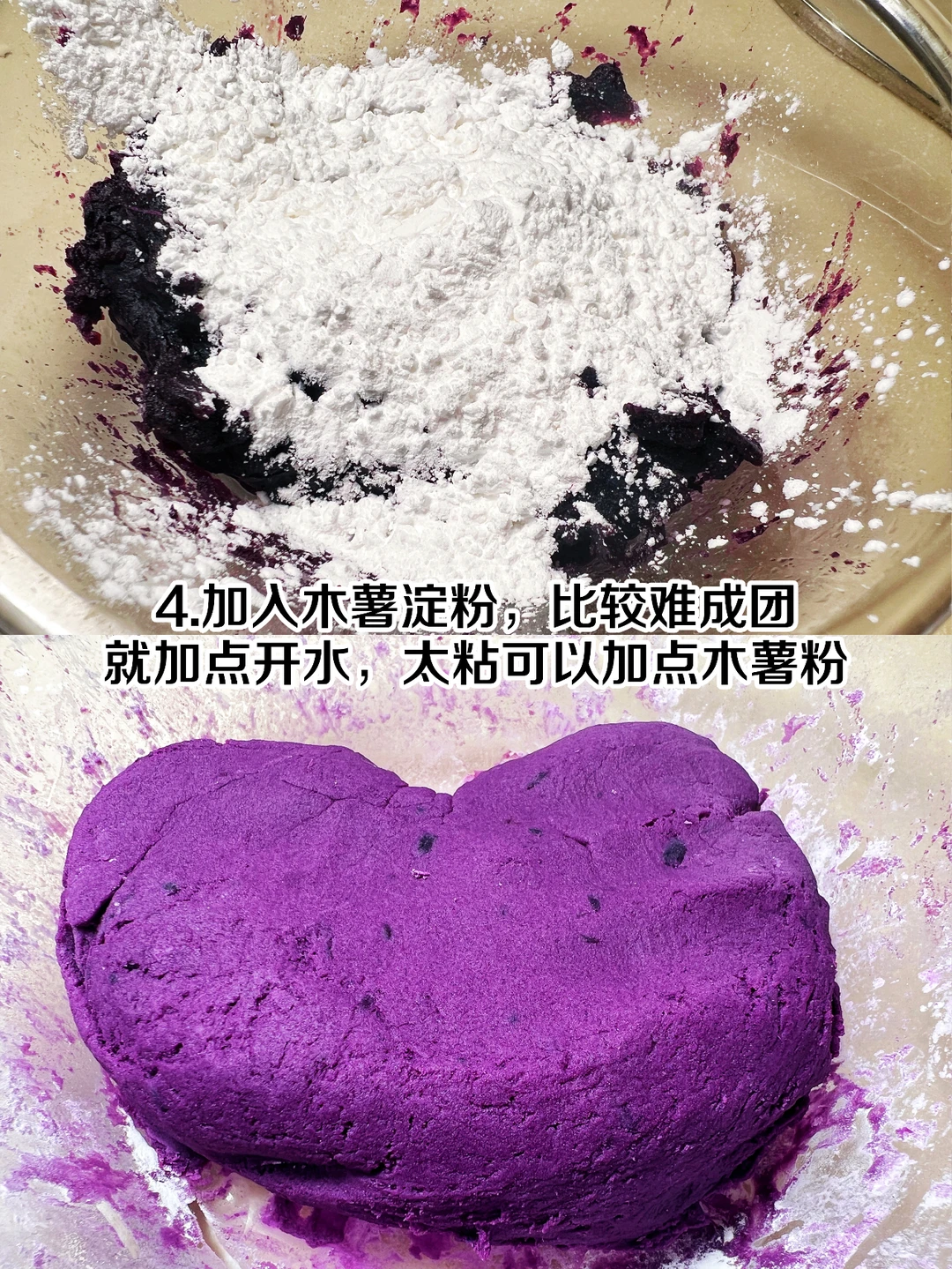 2.用紫薯举个例子,一般情况下紫薯:木薯粉=2:1,按照自己的紫薯湿度可以灵活去调整这个参考比例,喜欢吃Q弹有嚼劲的可以多加点木薯粉