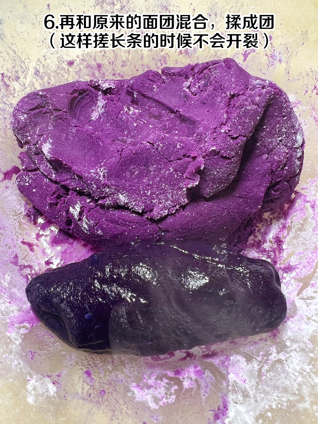 6、再和原来的面团混合,揉成团(这样搓长条的时候不会开裂)