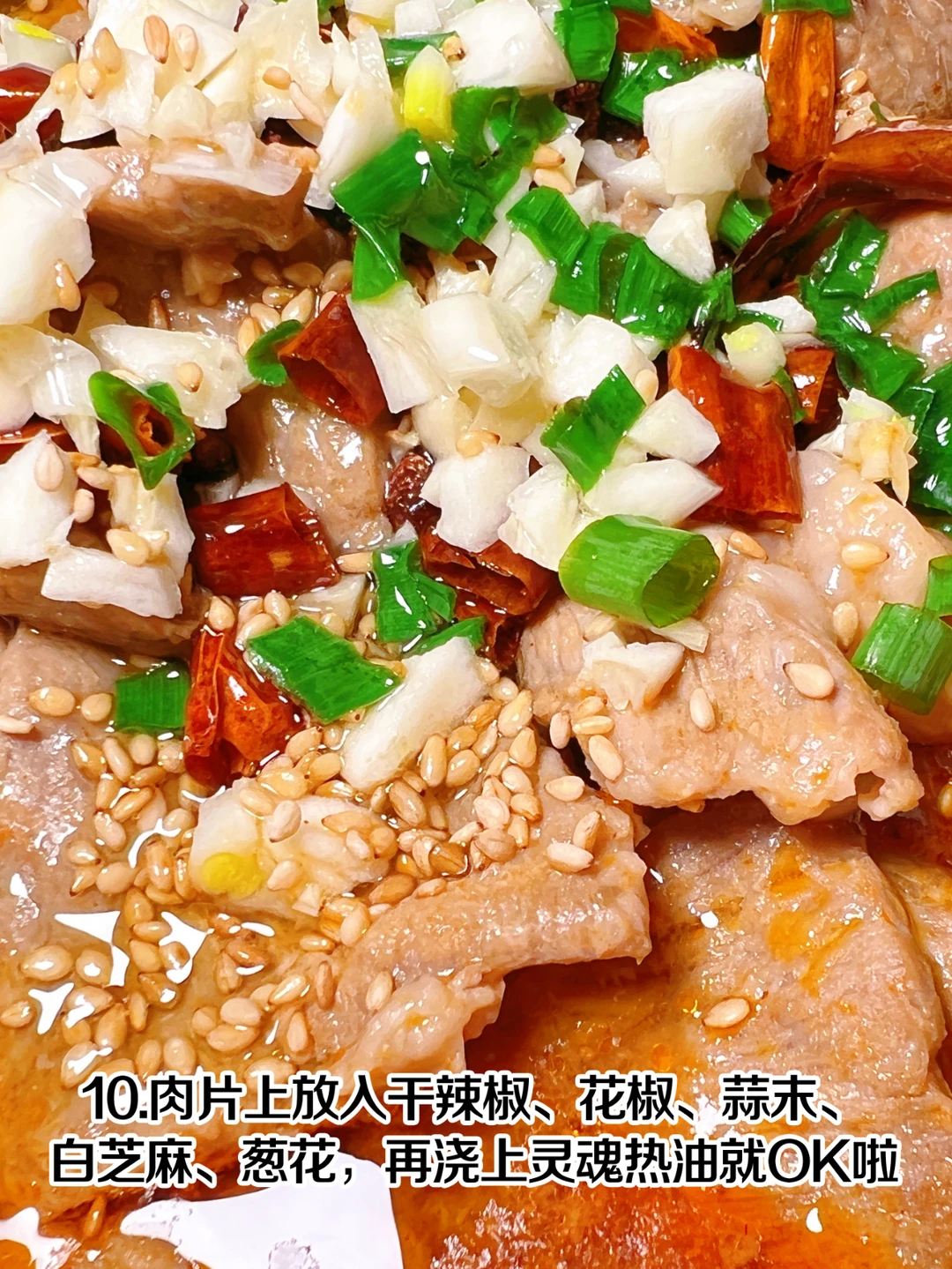 10、肉片上放入干辣椒、花椒、蒜末、白芝麻、葱花,再浇上灵魂热油就OK啦[得意R]