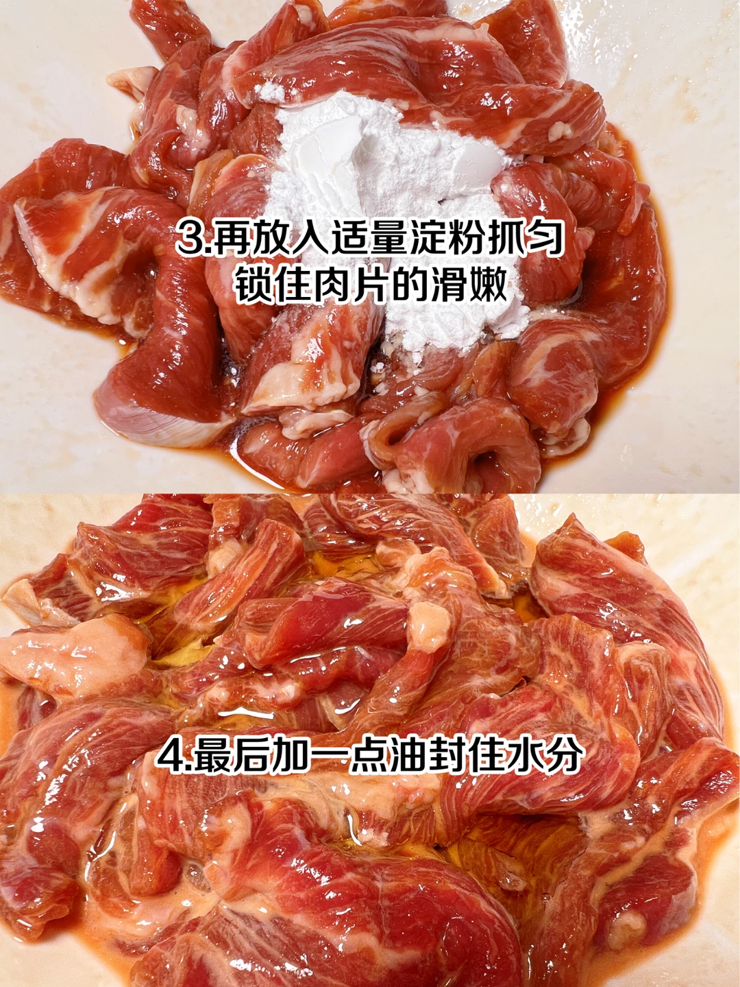 3、再放入适量淀粉抓匀,锁住肉片的滑嫩