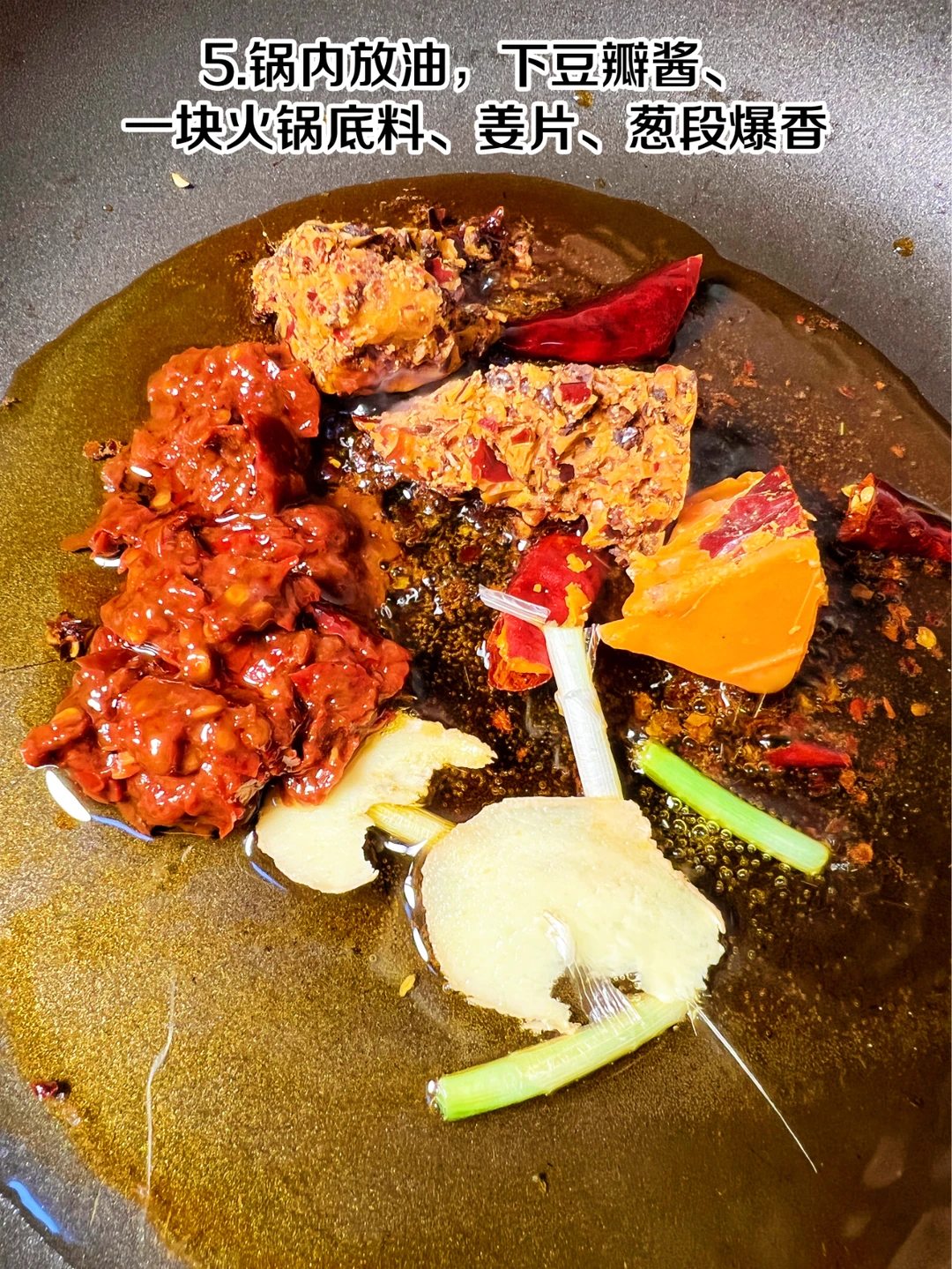 5、锅内放油,下豆瓣酱、一块火锅底料、姜片、葱段爆香