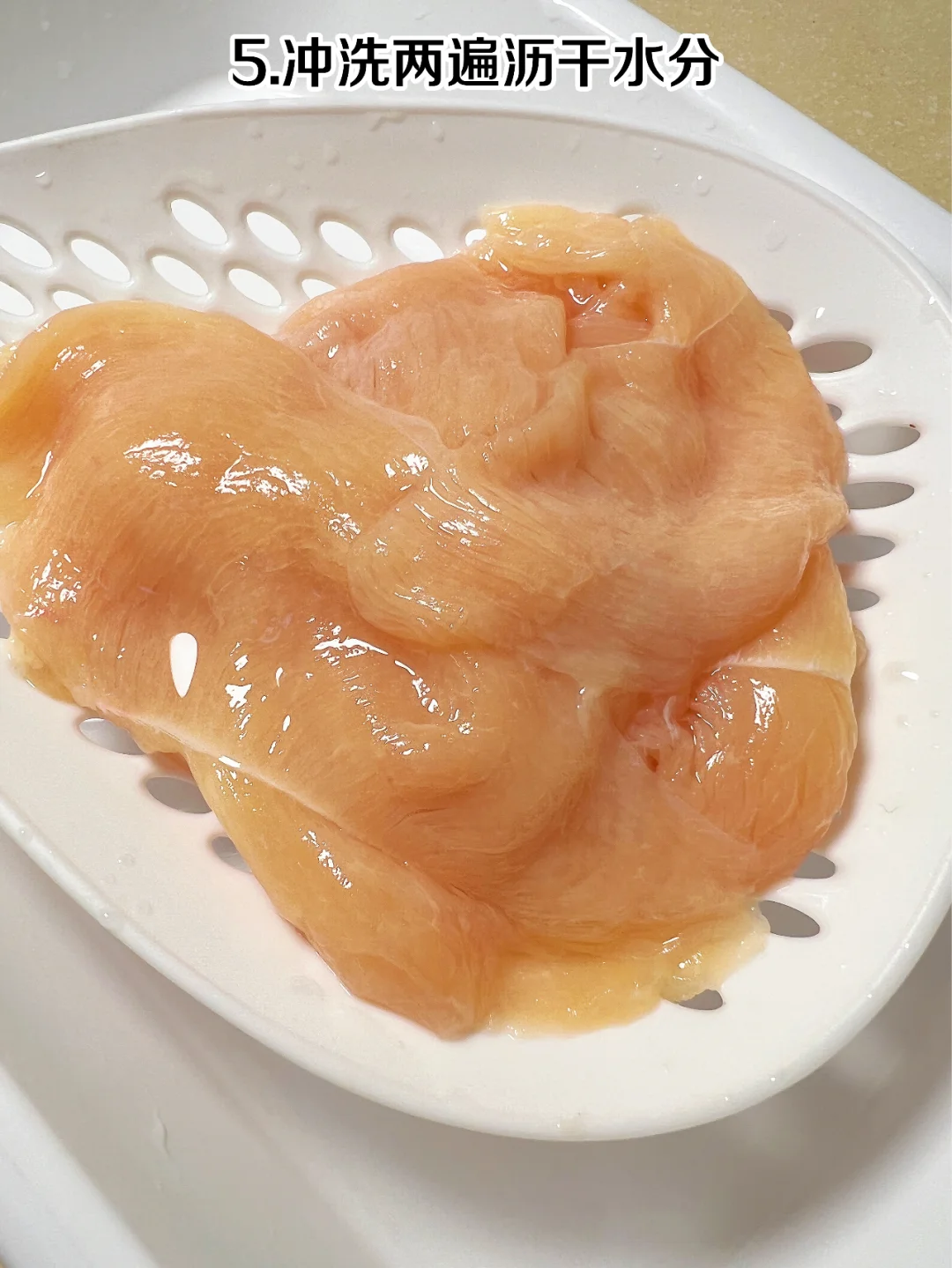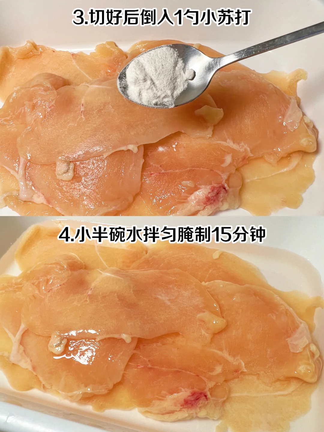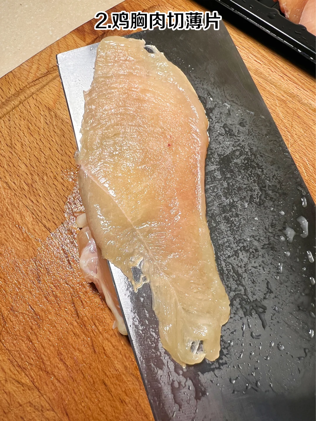 3.不爱吃鸡胸肉的姐妹们,也可以换成里脊肉,切记要用刀背敲一敲肉片,要不然会发柴。