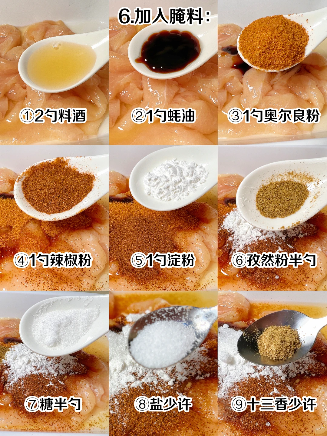 6.加入腌料:2勺料酒、1勺蚝油、1勺奥尔良粉、1勺辣椒粉、1勺淀粉、孜然粉半勺、糖半勺、盐少许、十三香少许。