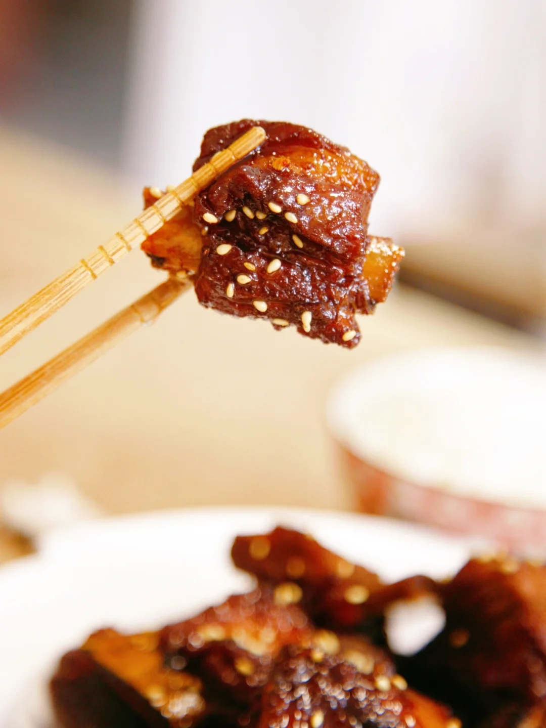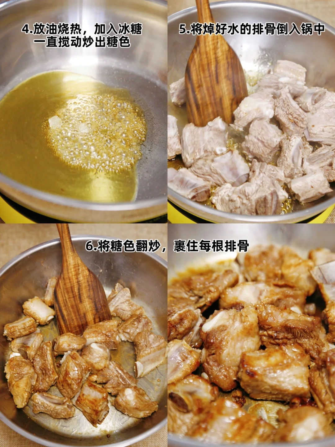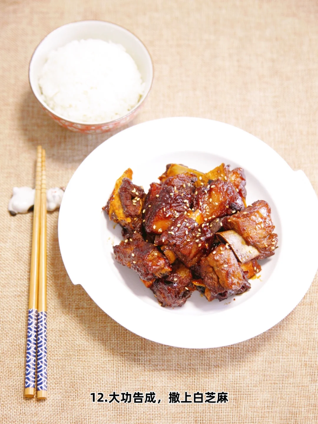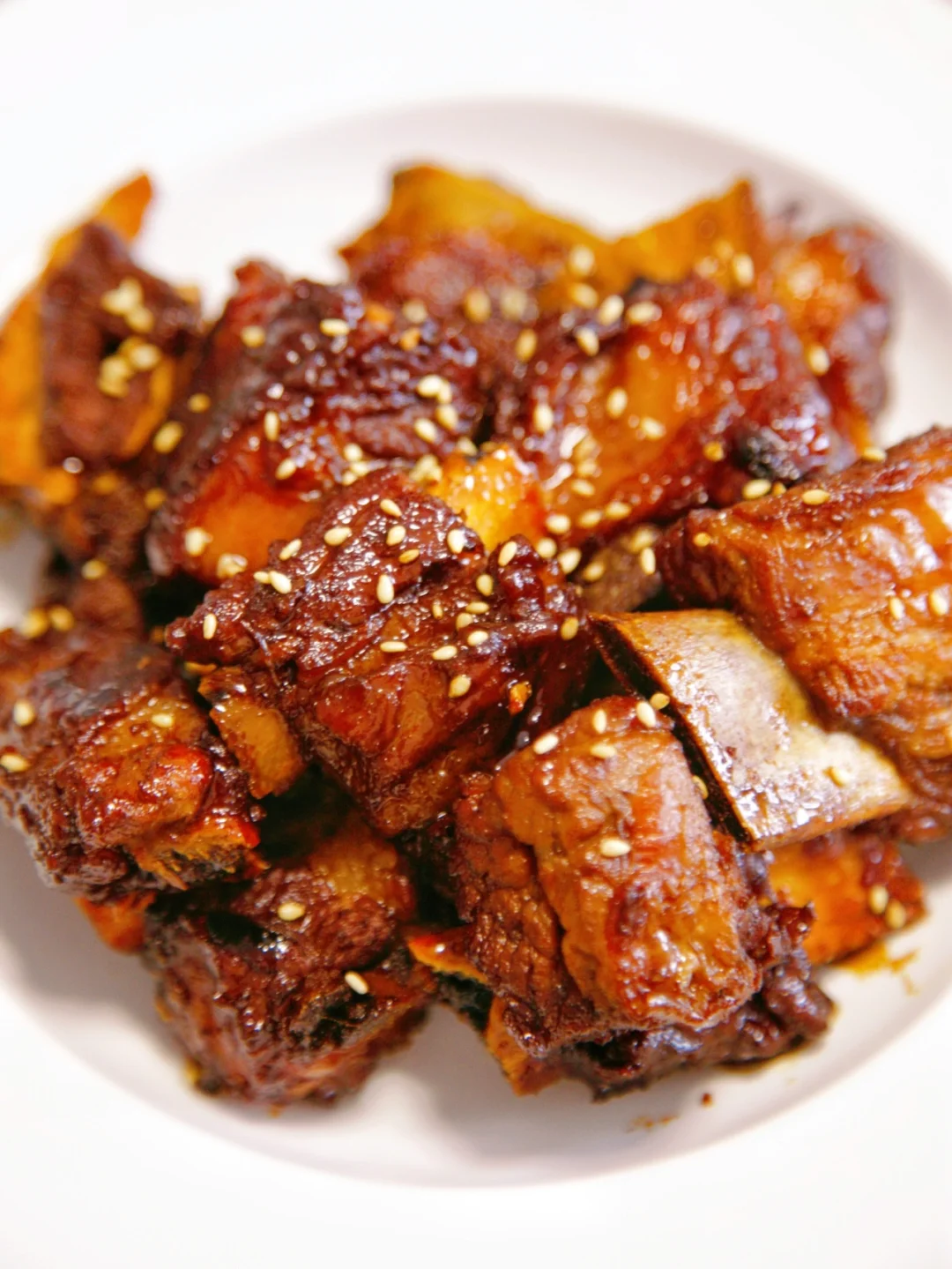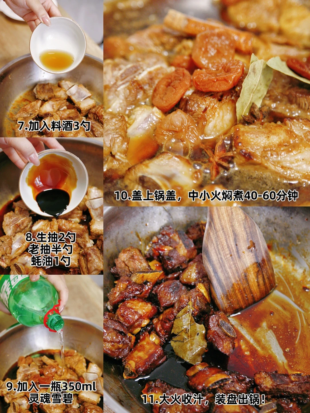 步骤:🌟 1.肋排洗净。 准备:几颗话梅即可(加入太多整体口味会变酸一些),桂皮、桂叶、姜片、冰糖、八角。 2.排骨冷水下锅,加葱、姜、料酒。 3.煮出血水后,捞出放入冷水中。 4.放油烧热,加入冰糖一直搅动炒出糖色。 5.将焯好水的倒入锅中。 6.将糖色翻炒,裹住每根排骨。 7.加入料酒3勺。 8.生抽2勺,老抽半勺,耗油1勺。 9.加入一瓶350ml灵魂雪碧。 10.盖上锅盖,中小火焖煮40-60分钟。 11.大火收汁,装盘出锅。 12.大功告成,撒上白芝麻。✌️